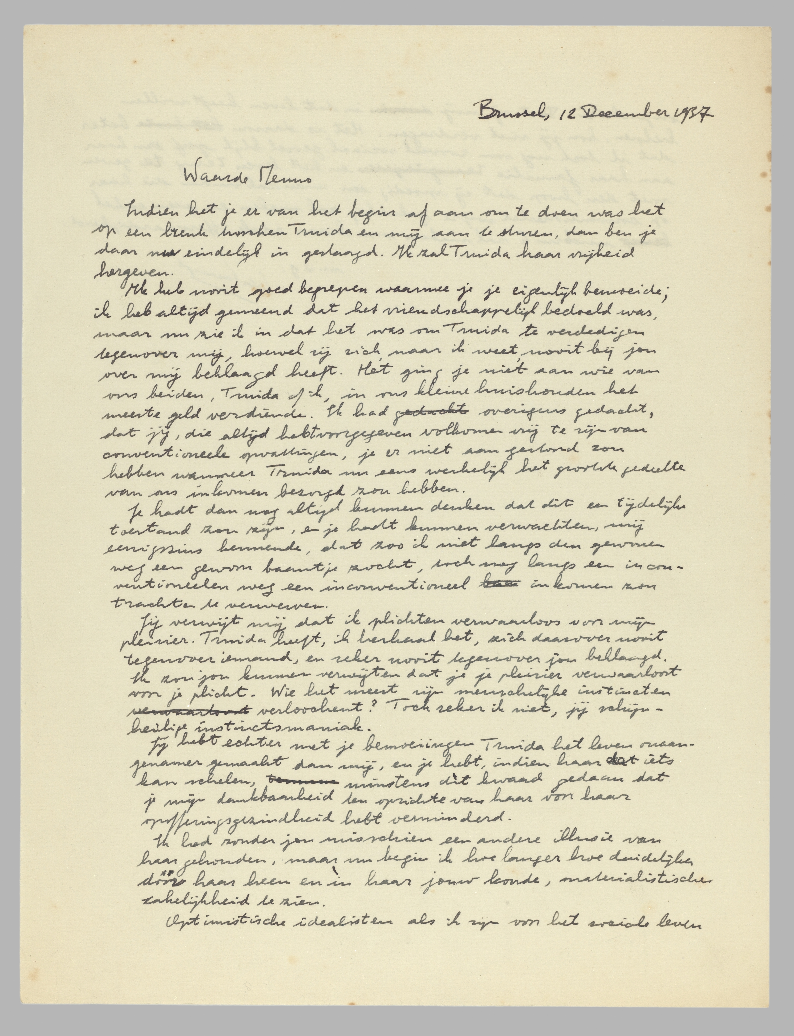 Ik heb nooit goed begrepen waarmee je je eigenlijk bemoeide; ik heb altijd gemeend dat het vriendschappelijk bedoeld was, maar nu zie ik in dat het was om Truida te verdedigen tegenover mij, hoewel zij zich, naar ik weet, nooit bij jou over mij beklaagd heeft. Het ging je niet aan wie van ons beiden, Truida of ik, in ons kleine huishouden het meeste geld verdiende. Ik had overigens gedacht, dat jij, die altijd hebt voorgegeven volkomen vrij te zijn van conventioneele opvattingen, je er niet aan gestoord zou hebben wanneer Truida nu eens werkelijk het grootste gedeelte van ons inkomen bezorgd zou hebben.