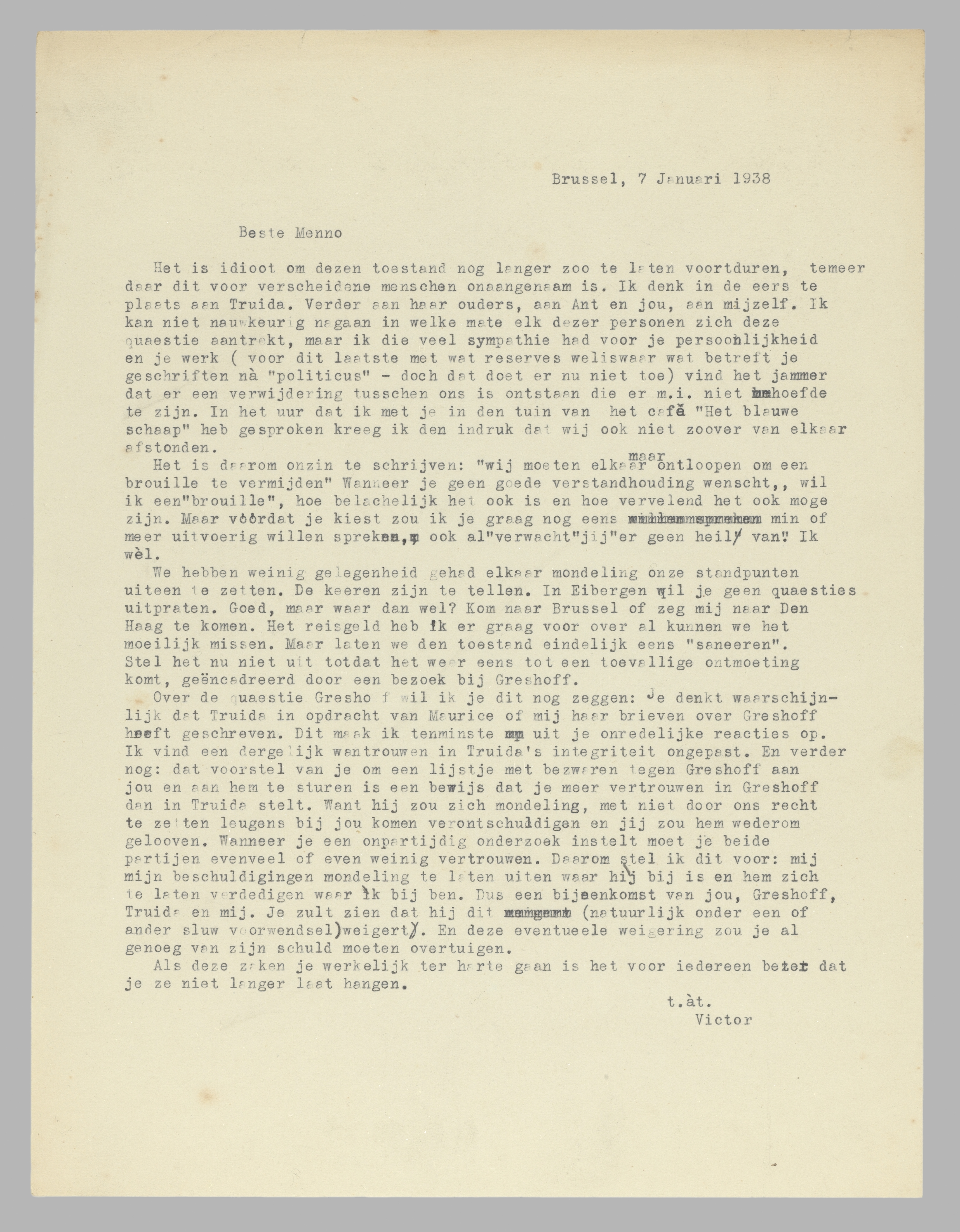 Het is idioot om dezen toestand nog langer zoo te laten voortduren, temeer daar dit voor verscheidene menschen onaagenaam is. Ik denk in de eerste plaats aan Truida. Verder aan haar ouders, aan Ant en jou, aan mijzelf. Ik kan niet nauwkeurig nagaan in welke mate elk dezer personen zich deze quaestie aantrekt, maar ik die veel sympathie had voor je persoonlijkheid en voor je werk (voor dit laatste met wat reserves weliswaar wat betreft je geschriften nà ‘politicus’ - doch dat doet er nu niet toe) vind het jammer dat er een verwijdering tusschen ons is ontstaan die er m.i. niet behoefde te zijn. In het uur dat ik met je in den tuin van het café ‘Het blauwe schaap’ heb gesproken kreeg ik den indruk dat wij ook niet zoover van elkaar afstonden.