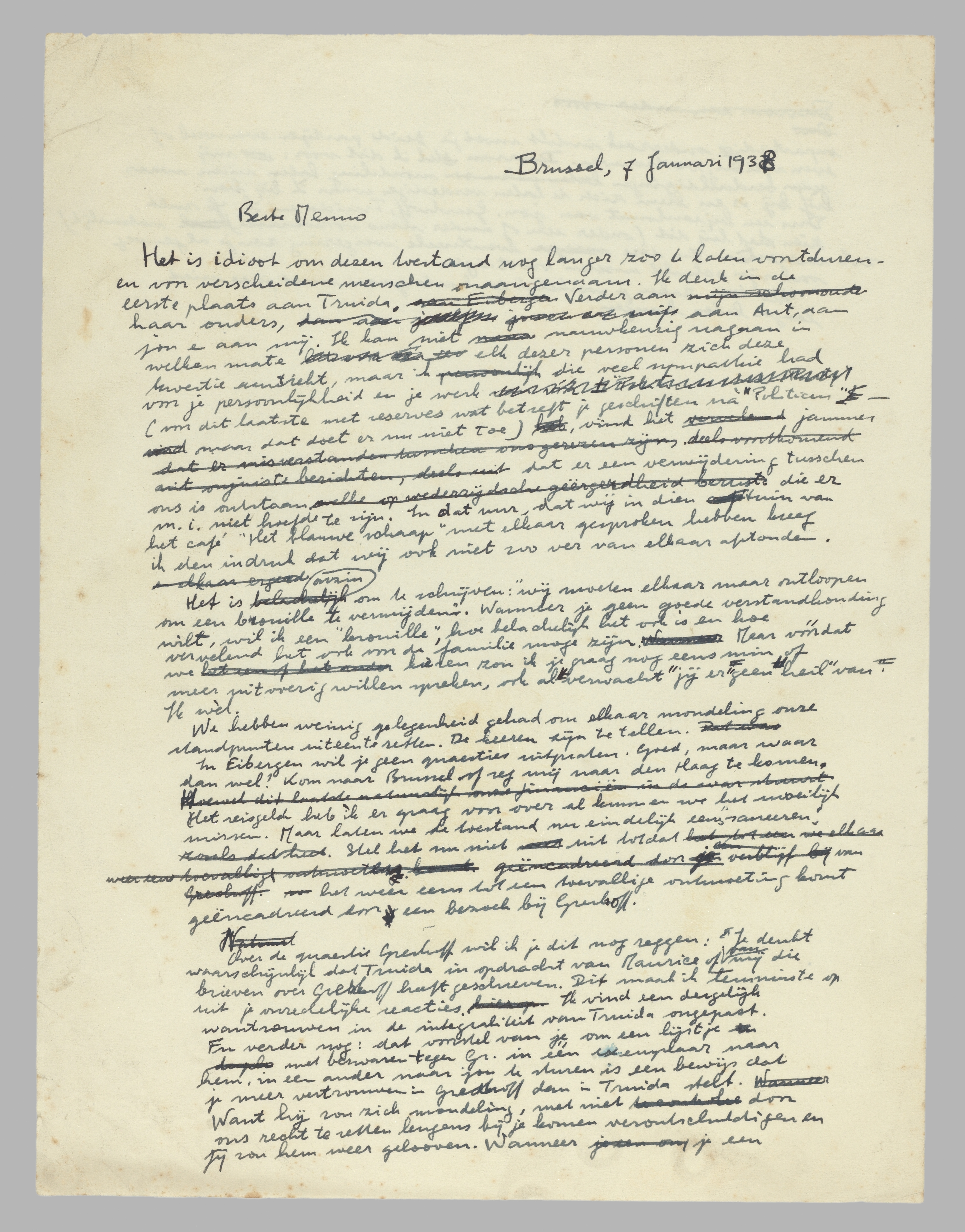 We hebben weinig gelegenheid gehad elkaar mondeling onze standpunten uiteen te zetten. De keeren zijn te tellen. In Eibergen wil je geen quaesties uitpraten. Goed, maar waar dan wel? Kom naar Brussel of zeg mij naar Den Haag te komen. Het reisgeld heb ik er graag voor over al kunnen we het moeilijk missen. Maar laten we den toestand eindelijk eens ‘saneeren’. Stel het nu niet uit totdat het weer eens tot een toevallige ontmoeting komt, geëncadreerd door een bezoek bij Greshoff.