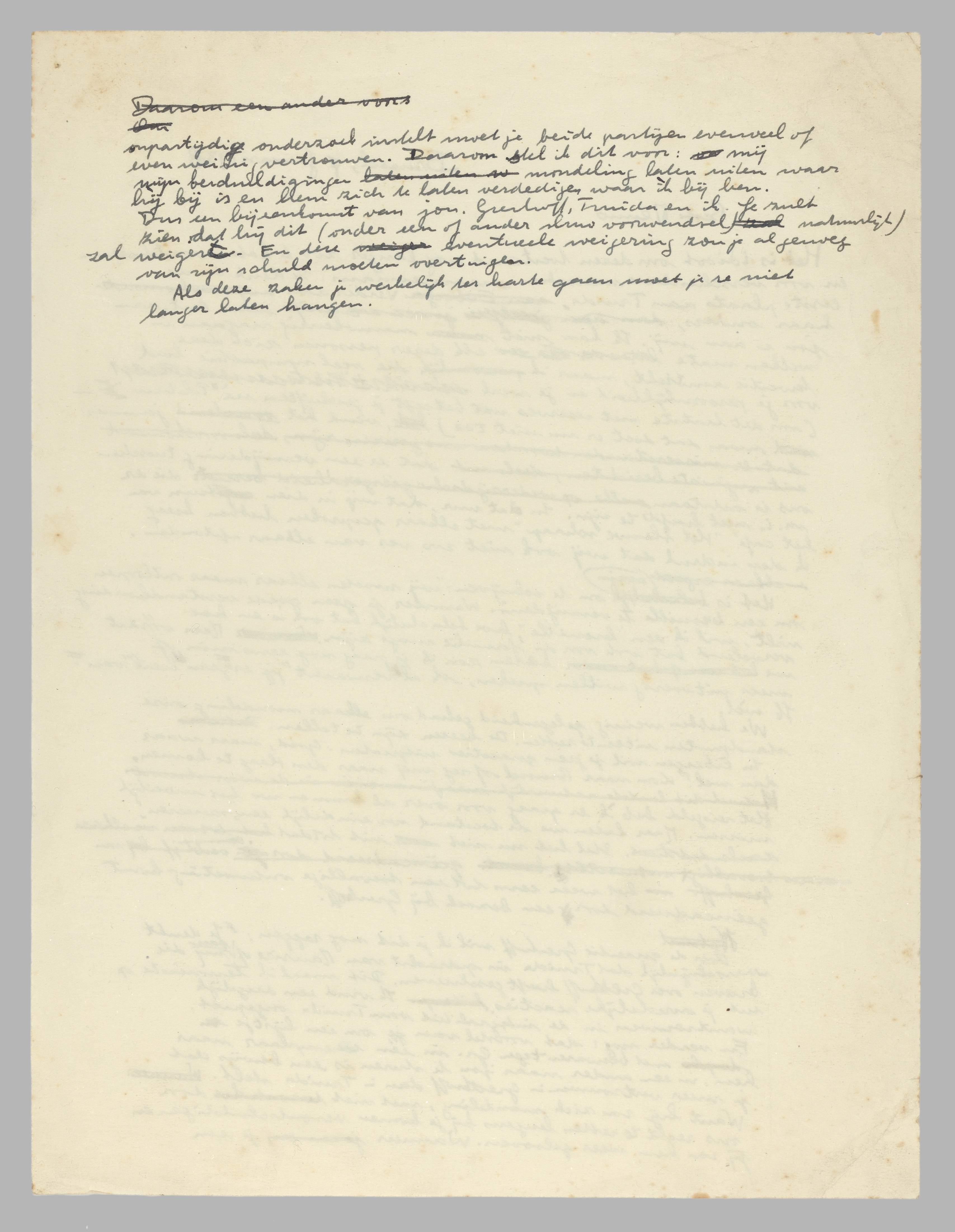 Over de quaestie Greshoff wil ik je nog dit zeggen: Je denkt waarschijnlijk dat Truida in opdracht van Maurice of mij haar brieven over Greshoff heeft geschreven. Dit maak ik tenminste uit je onredelijke reacties op. Ik vind een dergelijk wantrouwen in Truida's integriteit ongepast. En verder nog: dat voorstel van je om een lijstje met bezwaren tegen Greshoff aan jou en aan hem te sturen is een bewijs dat je meer vertrouwen in Greshoff dan in Truida stelt. Want hij zou zich mondeling, met niet door ons recht te zetten leugens bij jou komen verontschuldigen en jij zou hem wederom gelooven. Wanneer je een onpartijdig onderzoek instelt moet je beide partijen evenveel of weinig vertrouwen. Daarom stel ik dit voor: mij mijn beschuldigingen mondeling te laten uiten waar hij bij is en hem zich te laten verdedigen waar ik bij ben. Dus een bijeenkomst van jou, Greshoff, Truida en mij. Je zult zien dat hij dit (natuurlijk onder een of ander sluw voorwendsel) weigert. En deze eventueele weigering zou je al genoeg van zijn schuld moeten overtuigen.
