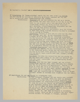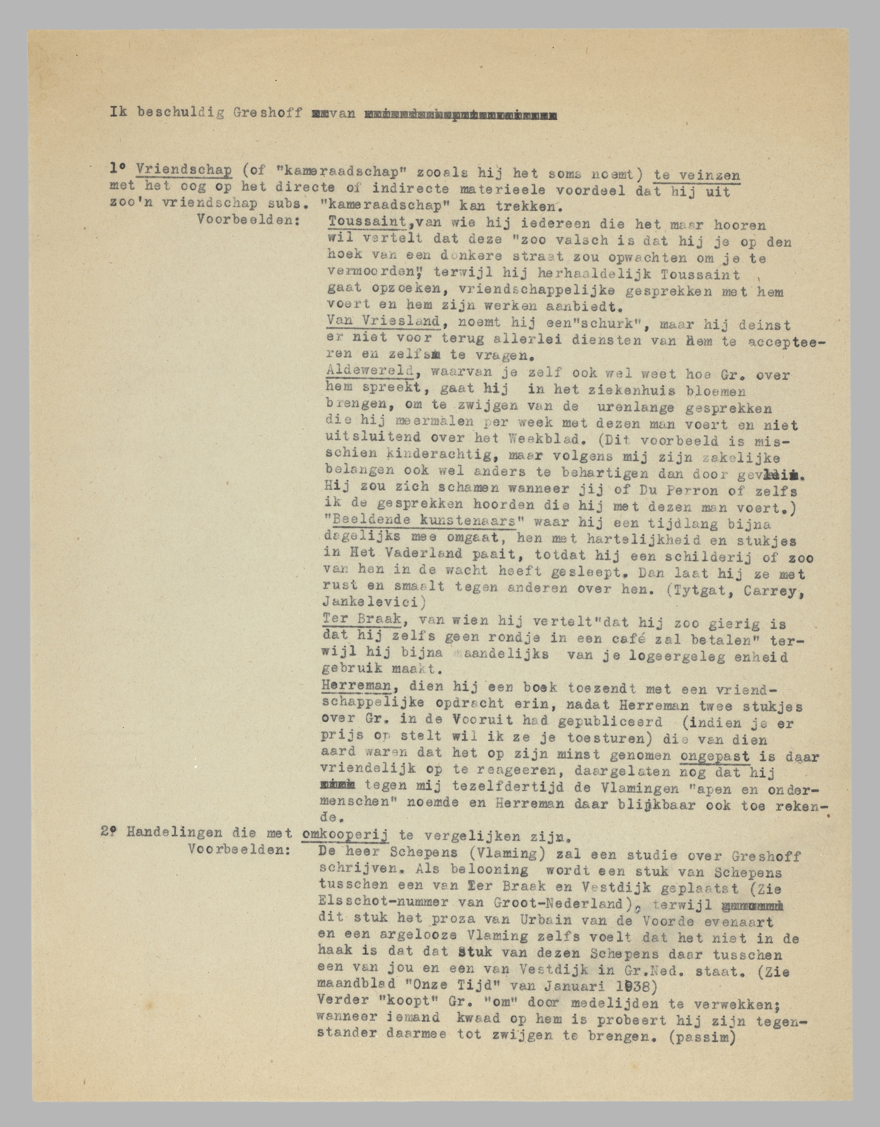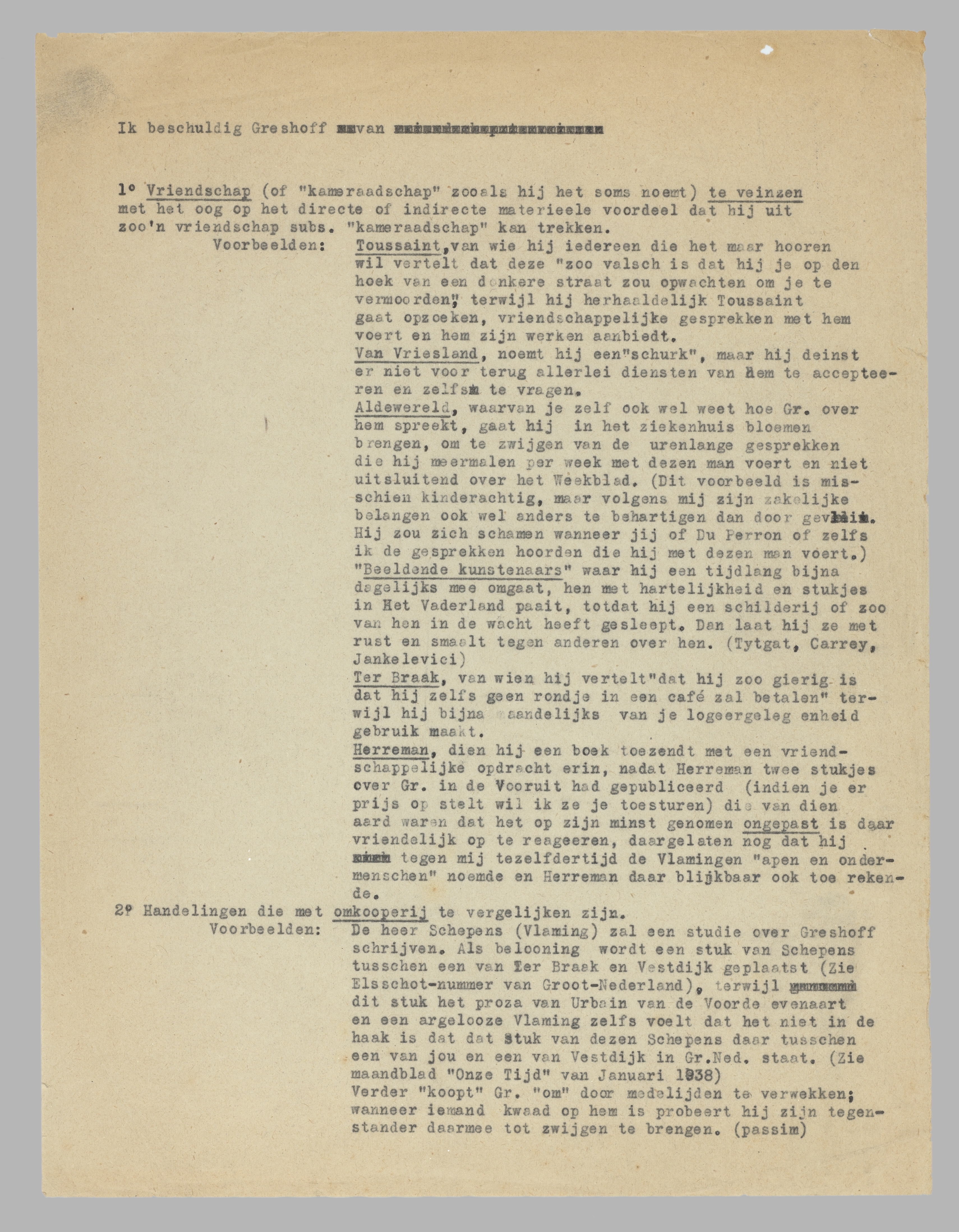 Voorbeelden: de heer Schepens (Vlaming) zal een studie over Greshoff schrijven. Als beloning wordt een stuk van Schepens tusschen een van ter Braak en Vestdijk geplaatst (Zie Elsschot-nummer van Groot-Nederland), terwijl dit stuk het proza van Urbain van de Voorde evenaart en een argelooze Vlaming zelfs voelt dat het niet in de haak is dat dat stuk van dezen Schepens daar tusschen een van jou en van Vestdijk in Gr. Ned. staat (zie maandblad ‘Onze Tijd’ van Januari 1938). Verder ‘koopt’ Gr. ‘om’ door medelijden te verwekken; wanneer iemand kwaad op hem is probeert hij zijn tegenstander daarmee tot zwijgen te brengen. (passim). Verder kan ik nog van ‘omkooperij’ spreken wanneer Greshoff's hartelijkheid in gevallen als onder 1e zich manifesteert in geschenken die niet meer als ‘attenties’ kunnen worden gequalificeerd, maar die eerder dienen om belangrijke tegendiensten uit te lokken dan om bewezen diensten te beloonen. (passim)