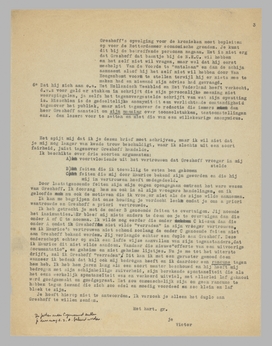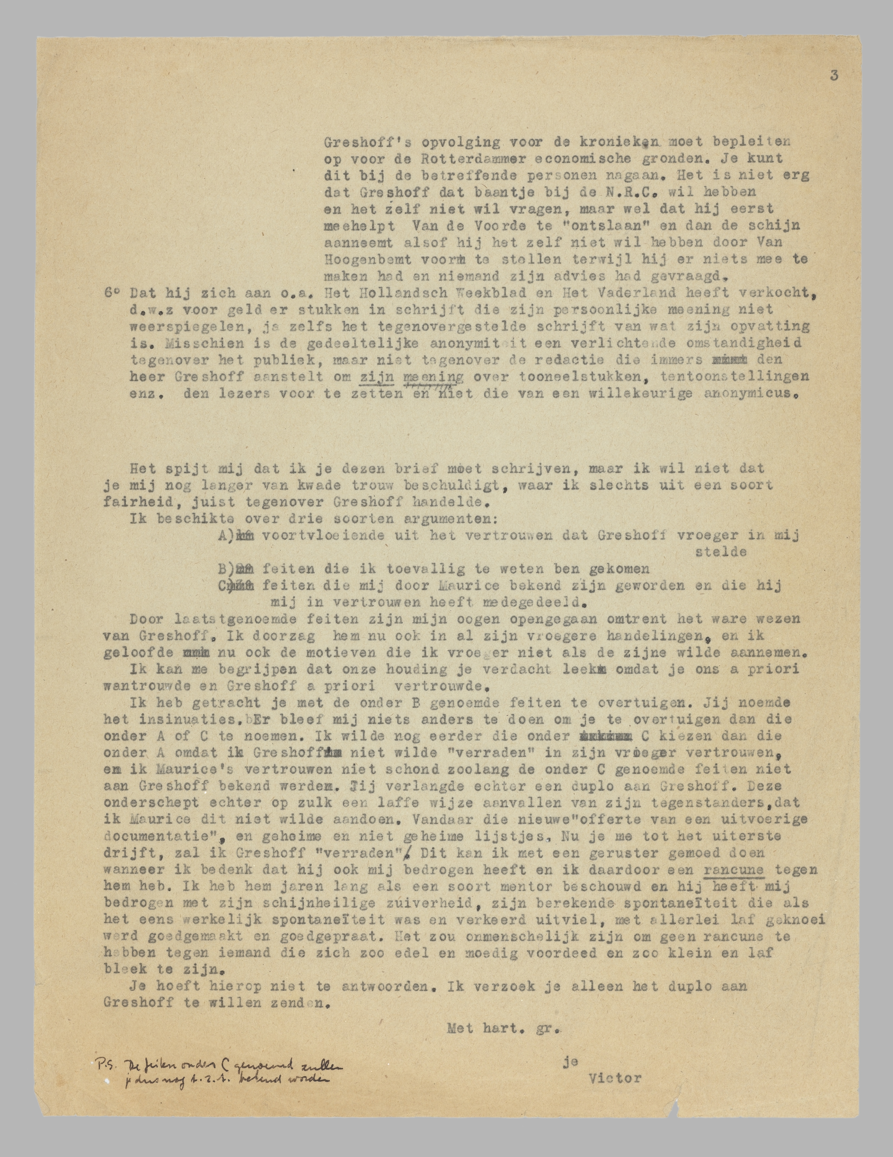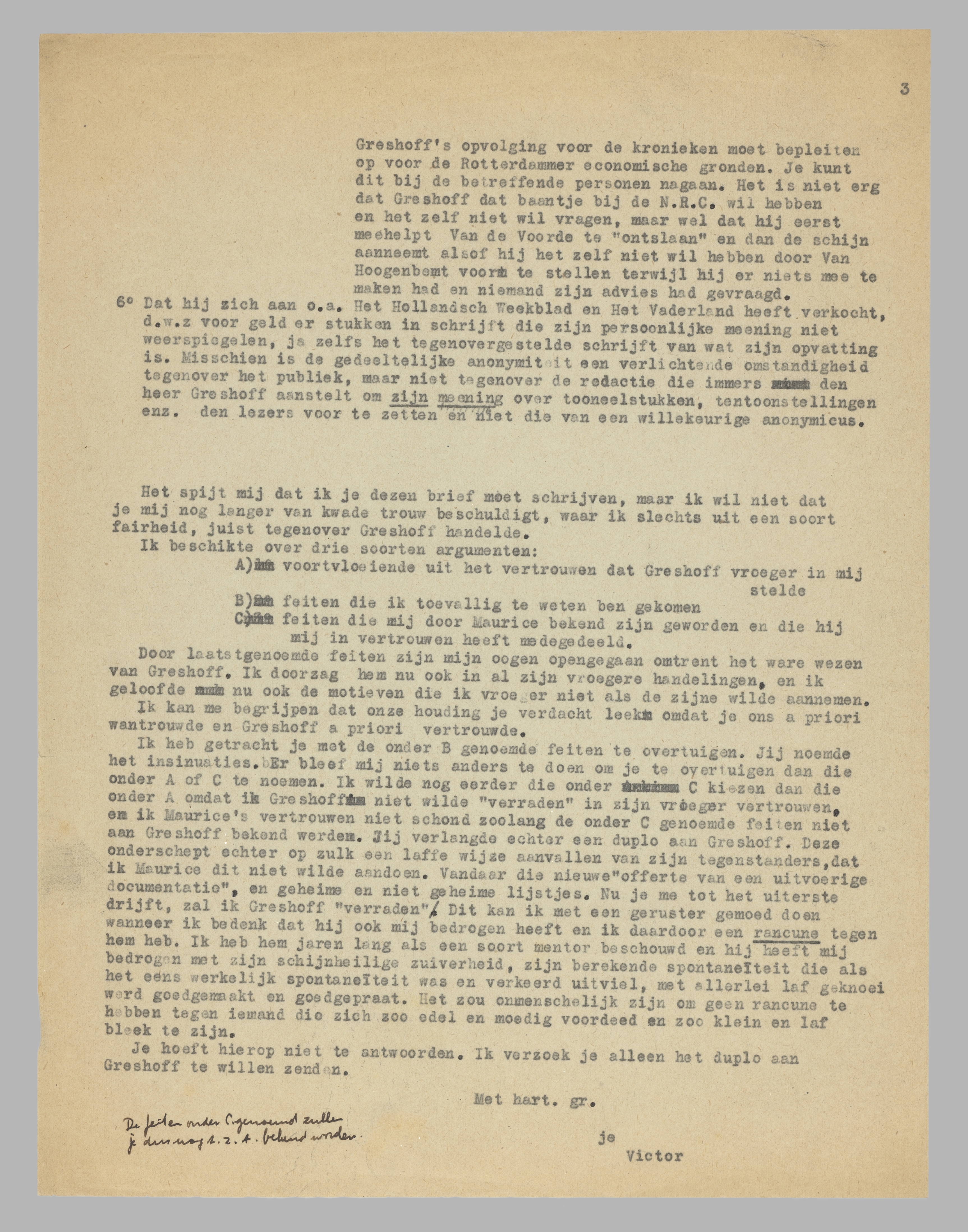 Ik heb getracht je met de onder b genoemde feiten te overtuigen. Jij noemde het insinuaties. Er bleef mij B niets anders te doen om je te overtuigen dan die onder A en C te noemen. Ik wilde nog eerder die onder C kiezen dan die onder A omdat ik Greshoff niet wilde ‘verraden’ in zijn vroeger vertrouwen, en ik Maurice's vertrouwen niet schond zoolang de onder C genoemde feiten niet aan Greshoff bekend werden, Jij verlangde echter een duplo aan Greshoff. Deze onderschept echter op zulk een laffe wijze aanvallen van zijn tegenstanders, dat ik Maurice dit niet wilde aandoen. Vandaar die nieuwe ‘offerte van een uitvoerige documentatie’, en geheime lijstjes. Nu je me tot het uiterste drijft, zal ik Greshoff ‘verraden’. Dit kan ik met een geruster gemoed doen wanneer ik bedenk dat hij ook mij bedrogen heeft en ik daardoor een rancune tegen hem heb. Ik heb hem jaren lang als een soort mentor beschouwd en hij heeft mij bedrogen met zijn schijnheilige zuiverheid, zijn berekende spontaneïteit die als het een werkelijk spontaneïteit was en verkeerd uitviel, met allerlei laf geknoei werd goedgemaakt en goedgepraat. Het zou onmenschelijk zijn om geen rancune te hebben tegen iemand die zich zoo edel en moedig voordeed en zoo klein en laf bleek te zijn.