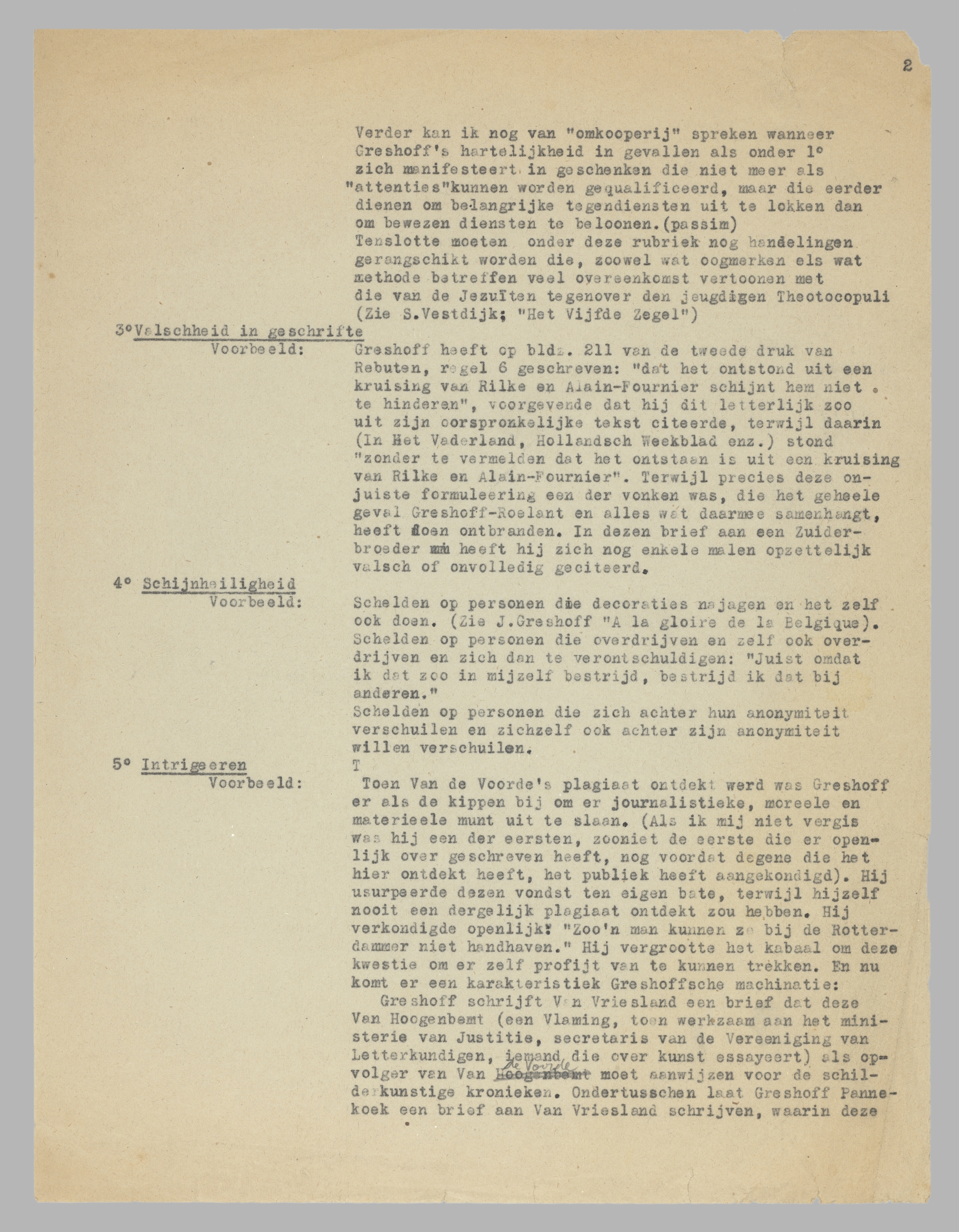 Voorbeeld: Toen Van de Voorde's plagiaat ontdekt werd was Greshoff er als de kippen bij om er journalistieke, moreele en materieele munt uit te slaan. (Als ik mij niet vergis was hij een der eersten, zoniet de eerste die er openlijk over geschreven heeft, nog voordat degene die het hier ontdekt heeft, het publiek heeft aangekondigd). Hij usurpeerde dezen vondst ten eigen bate, terwijl hijzelf nooit een dergelijk plagiaat ontdekt zou hebben. Hij verkondigde openlijk: ‘Zoo'n man kunnen ze bij de Rotterdammer niet handhaven.’ Hij vergrootte het kabaal om deze kwestie om er zelf profijt van te kunnen trekken. En nu komt er een karakteristiek van Greshoffsche machinatie: Greshoff schrijft Van Vriesland een brief dat deze Van Hoogenbemt (een Vlaming, toen werkzaam aan het Ministerie van Justitie, secretaris van de Vereeniging van Letterkundigen, iemand die over kunst essayeert) als opvolger van Van de Voorde moet aanwijzen voor de schilderkunstige kronieken. Ondertusschen laat Greshoff Pannekoek een brief aan van Vriesland schrijven, waarin deze Greshoff's opvolging voor de kronieken moet bepleiten op voor de Rotterdammer economische gronden. Je kunt dit bij de betreffende personen nagaan. Het is niet erg dat Greshoff dat baantje bij de N.R.C. wil hebben en het zelf niet wil vragen, maar wel dat hij eerst meehelpt van de Voorde te ‘ontslaan’ en dan de schijn aanneemt alsof hij het zelf niet wil hebben door Van Hoogenbemt voor te stellen terwijl hij er niets mee te maken had en niemand zijn advies had gevraagd.