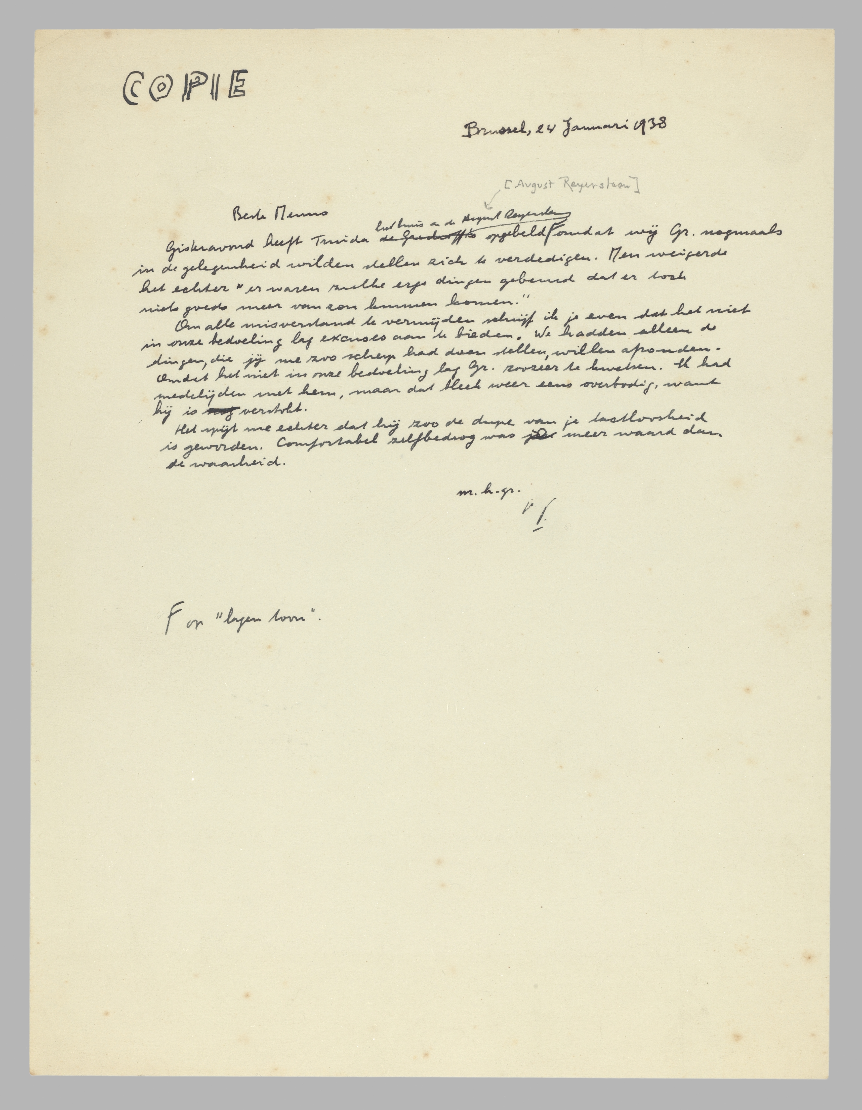 Gisteravond heeft Truida het huis in de August Reyerslaan opgebeld <op ‘lagen toon’> omdat wij Gr. nogmaals in de gelegenheid wilden stellen zich te verdedigen. Men weigerde het echter 'er waren zulke erge dingen gebeurd dat er toch niets goeds meer van zou kunnen komen.