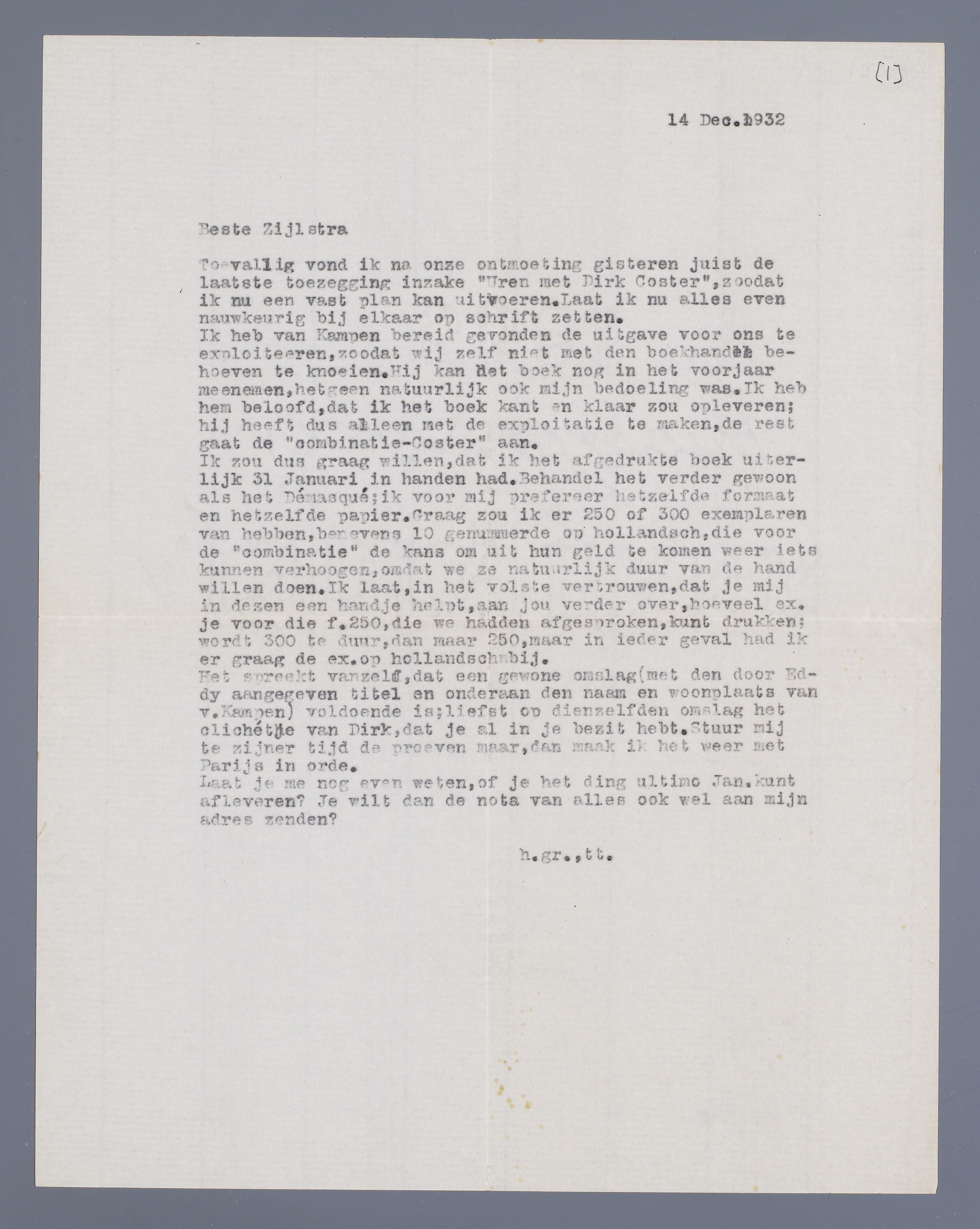 Ik zou dus graag willen, dat ik het afgedrukte boek uiterlijk 31 januari in handen had. Behandel het verder gewoon als het Démasqué; ik voor mij prefereer hetzelfde formaat en hetzelfde papier. Graag zou ik er 250 of 300 exemplaren van hebben, benevens 10 genummerde op hollandsch, die voor de ‘combinatie’ de kans om uit hun geld te komen weer iets kunnen verhoogen, omdat we ze natuurlijk duur van de hand willen doen. Ik laat, in het volste vertrouwen, dat je mij in dezen een handje helpt, aan jou verder over, hoeveel ex. je voor die f. 250, die we hadden afgesproken, kunt drukken; wordt 300 te duur, dan maar 250, maar in ieder geval had ik er graag de ex. op hollandsch bij.