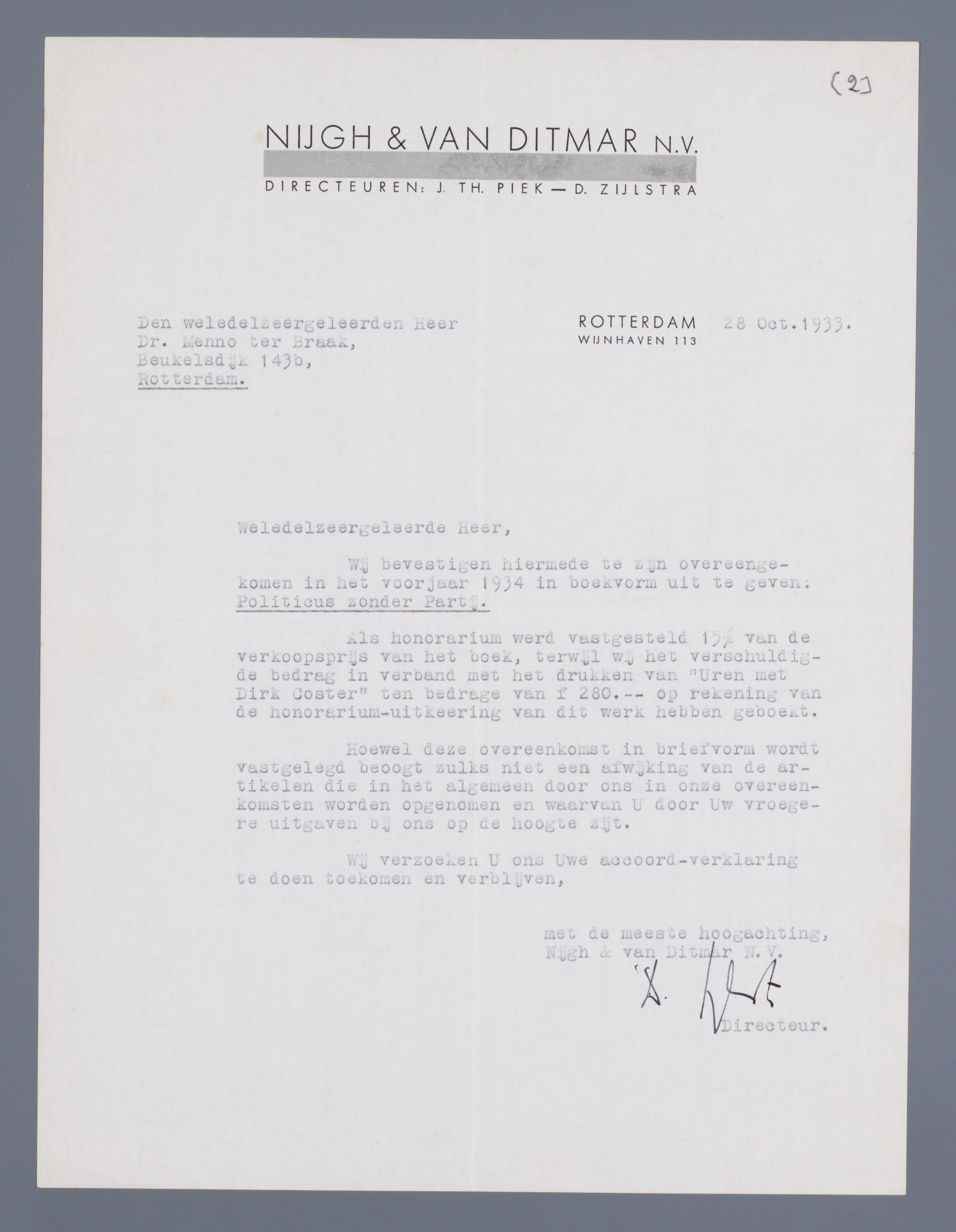 Wij bevestigen hiermede te zijn overeengekomen in het voorjaar 1934 in boekvorm uit te geven: Politicus zonder Partij.
