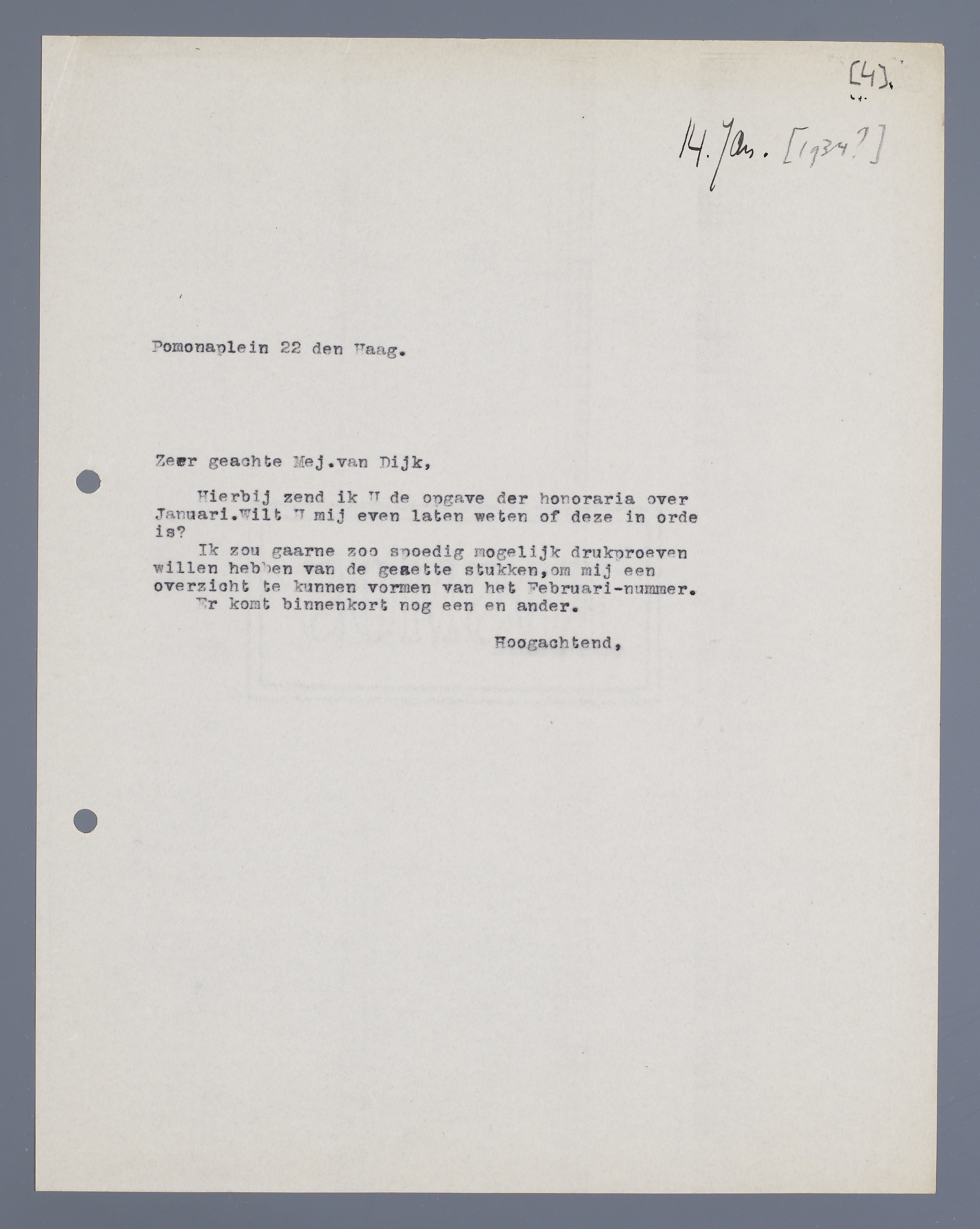 Ik zou gaarne zoo spoedig mogelijk drukproeven willen hebben van de gezette stukken, om mij een overzicht te kunnen vormen van het februari-nummer. Er komt binnenkort nog een en ander.