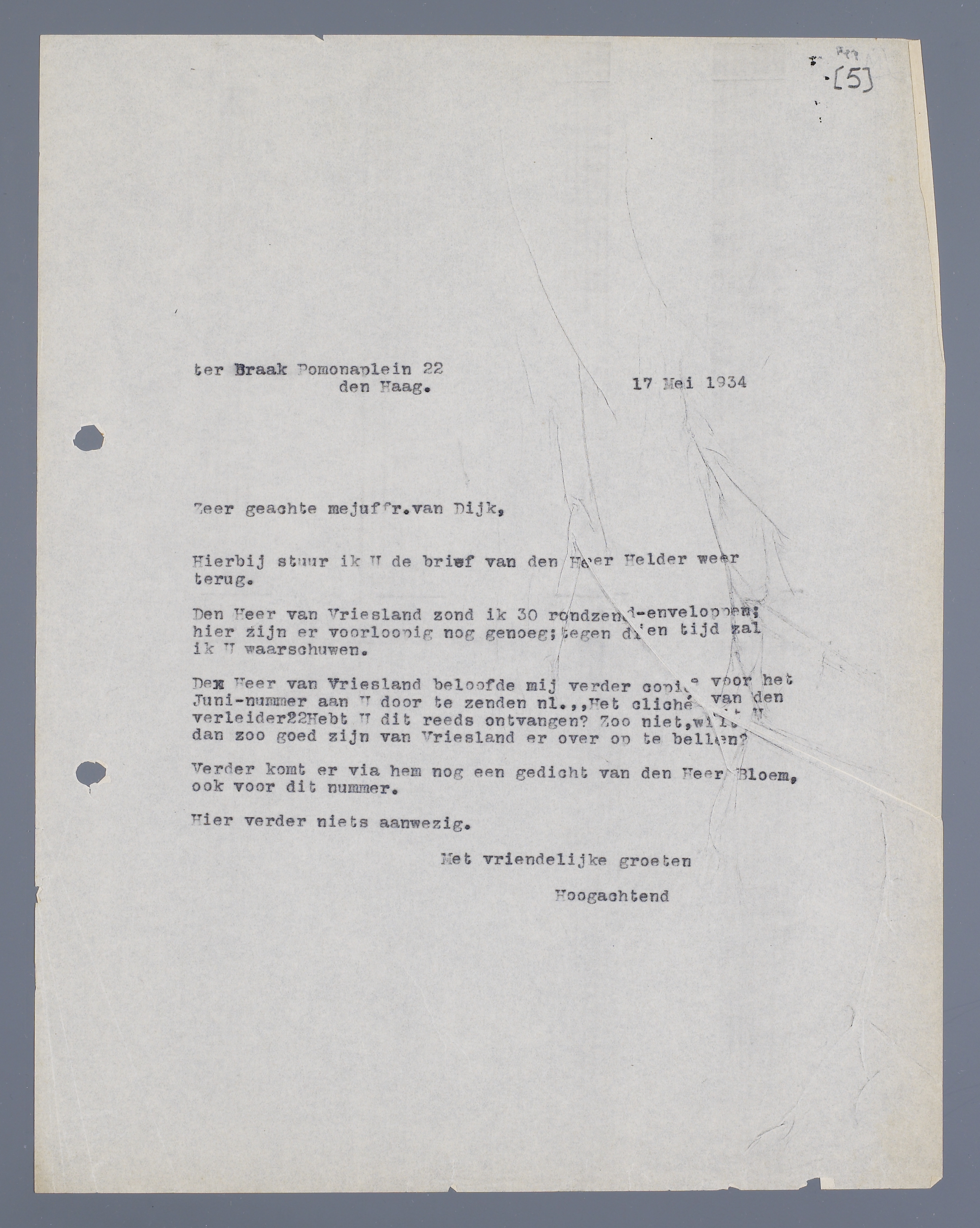 Den Heer van Vriesland beloofde mij verder copieën voor het juni-nummer aan U door te zenden nl. ‘het cliché van den verleider’ hebt U dit reeds ontvangen? Zoo niet, wilt U dan zoo goed zijn van Vriesland er over op te bellen?