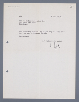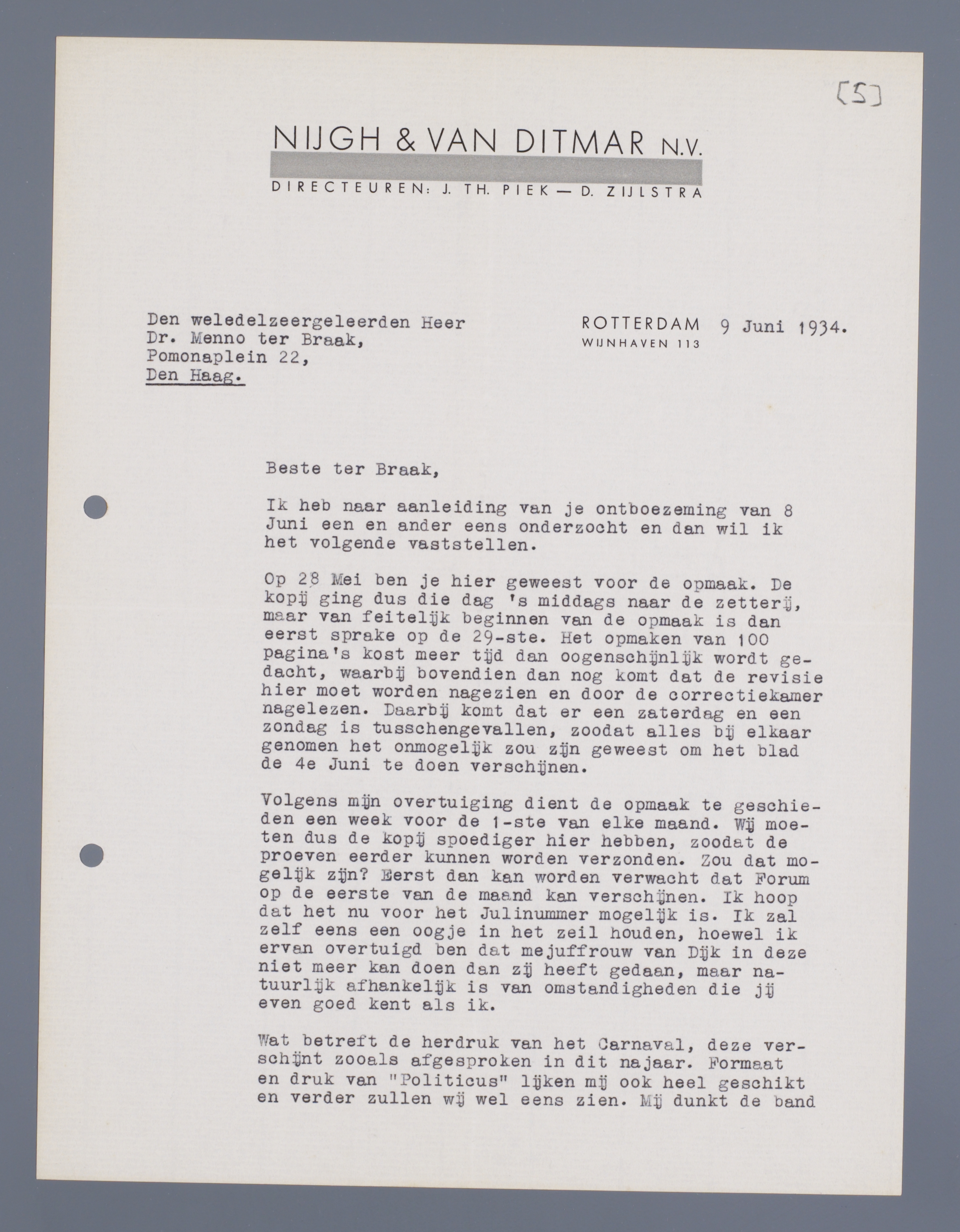 Volgens mijn overtuiging dient de opmaak te geschieden een week voor de 1-ste van elke maaND. Wij moeten dus de kopij spoediger hier hebben, zoodat de proeven eerder kunnen worden verzonden. Zou dat mogelijk zijn? Eerst dan kan worden verwacht dat Forum op de eerste van de maand kan verschijnen. Ik hoop dat het nu voor het Julinummer mogelijk is. Ik zal zelf eens een oogje in het zeil houden, hoewel ik ervan overtuigd ben dat mejuffrouw van Dijk in deze niet meer kan doen dan zij heeft gedaan, maar natuurlijk afhankelijk is van omstandigheden die jij even goed kent als ik.
