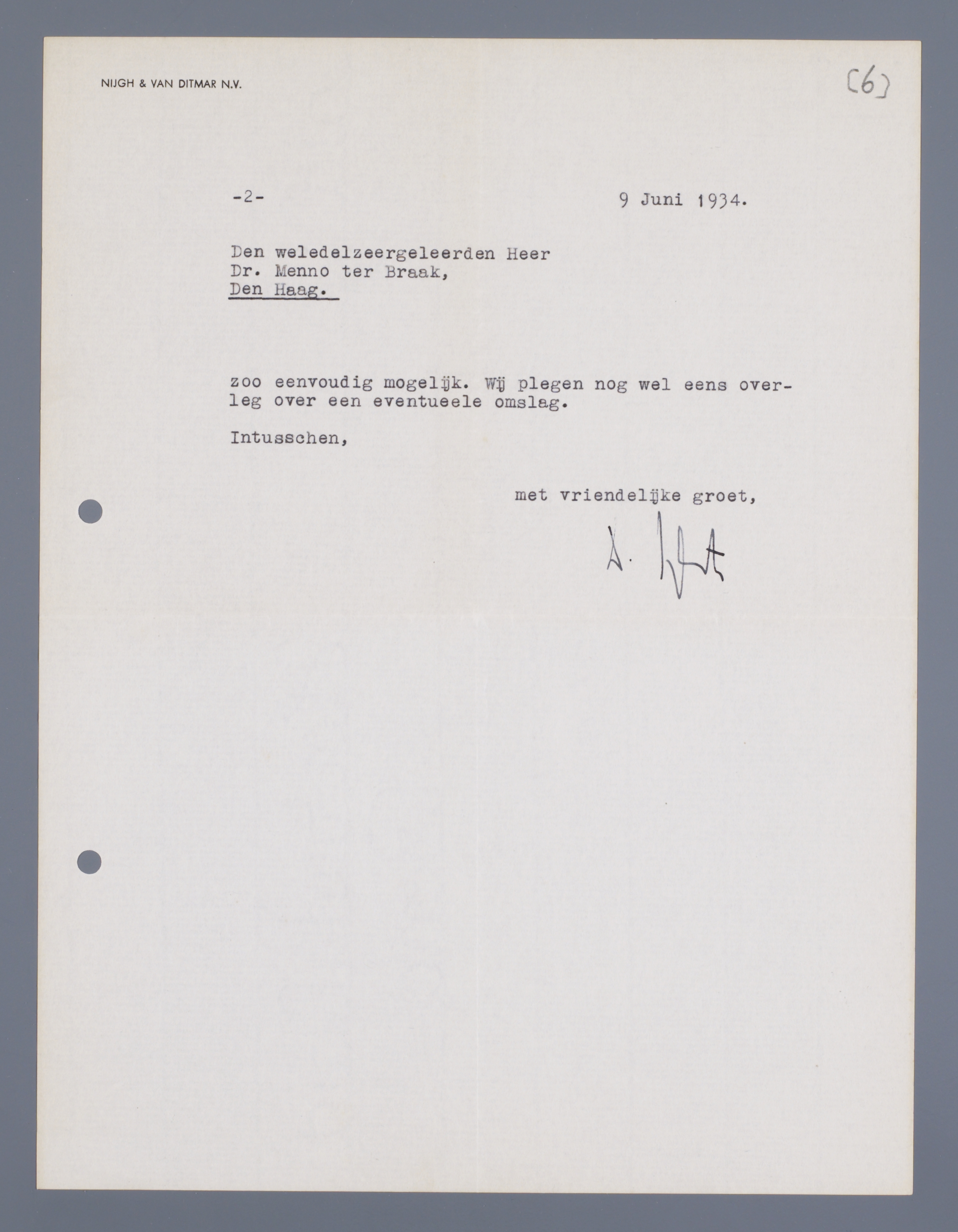 Wat betreft de herdruk van het Carnaval, deze verschijnt zooals afgesproken in dit najaar. Formaat en druk van ‘Politicus’ lijken mij ook heel geschikt en verder zullen wij wel eens zien. Me dunkt de band zoo eenvoudig mogelijk. Wij plegen nog wel eens overleg over een eventueele omslag.