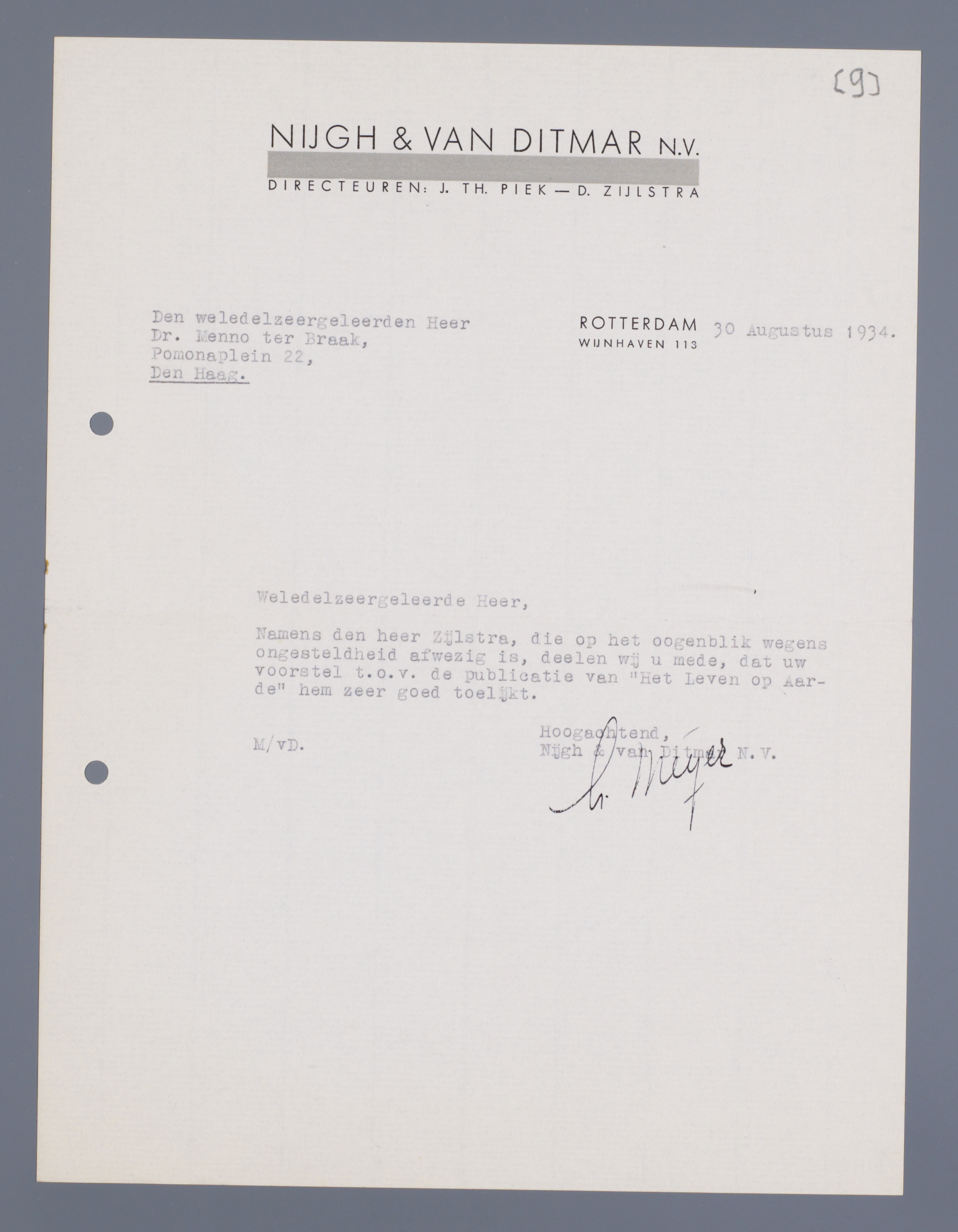 Namens den heer Zijlstra, die op het oogenblik wegens ongesteldheid afwezig is, deelen wij u mede, dat uw voorstel t.o.v. de publicatie van ‘Het leven op Aarde’ hem zeer goed toelijkt.