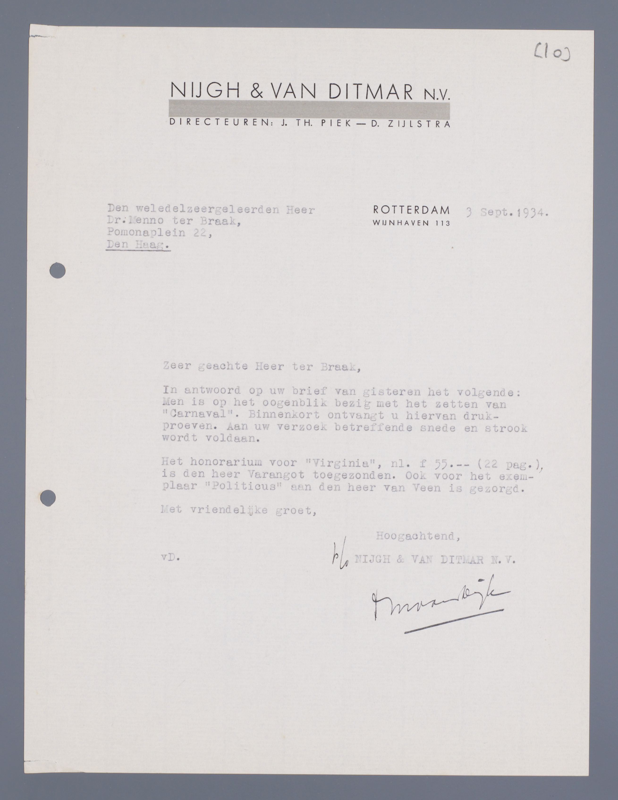 Het honorarium voor ‘Virginia’, nl. f.55.- (22 pag.), is den heer Varangot toegezonden. Ook voor het exemplaar ‘Politicus’ aan den heer van Veen is gezorgd.