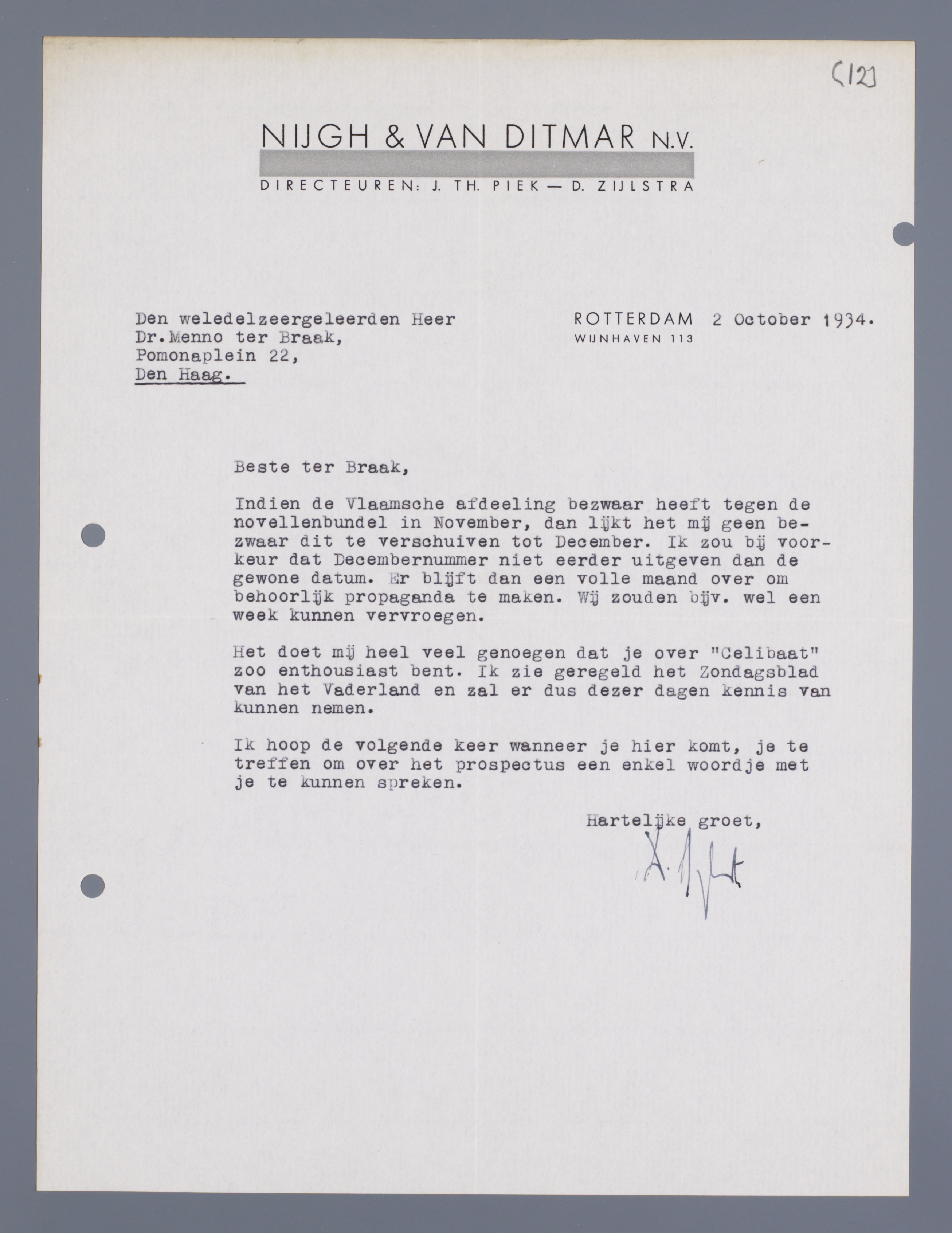 Het doet mij heel veel genoegen dat je over ‘Celibaat’ zoo enthousiast bent. Ik zie geregeld het Zondagsblad van het Vaderland en zal er dus dezer dagen kennis van kunnen nemen.