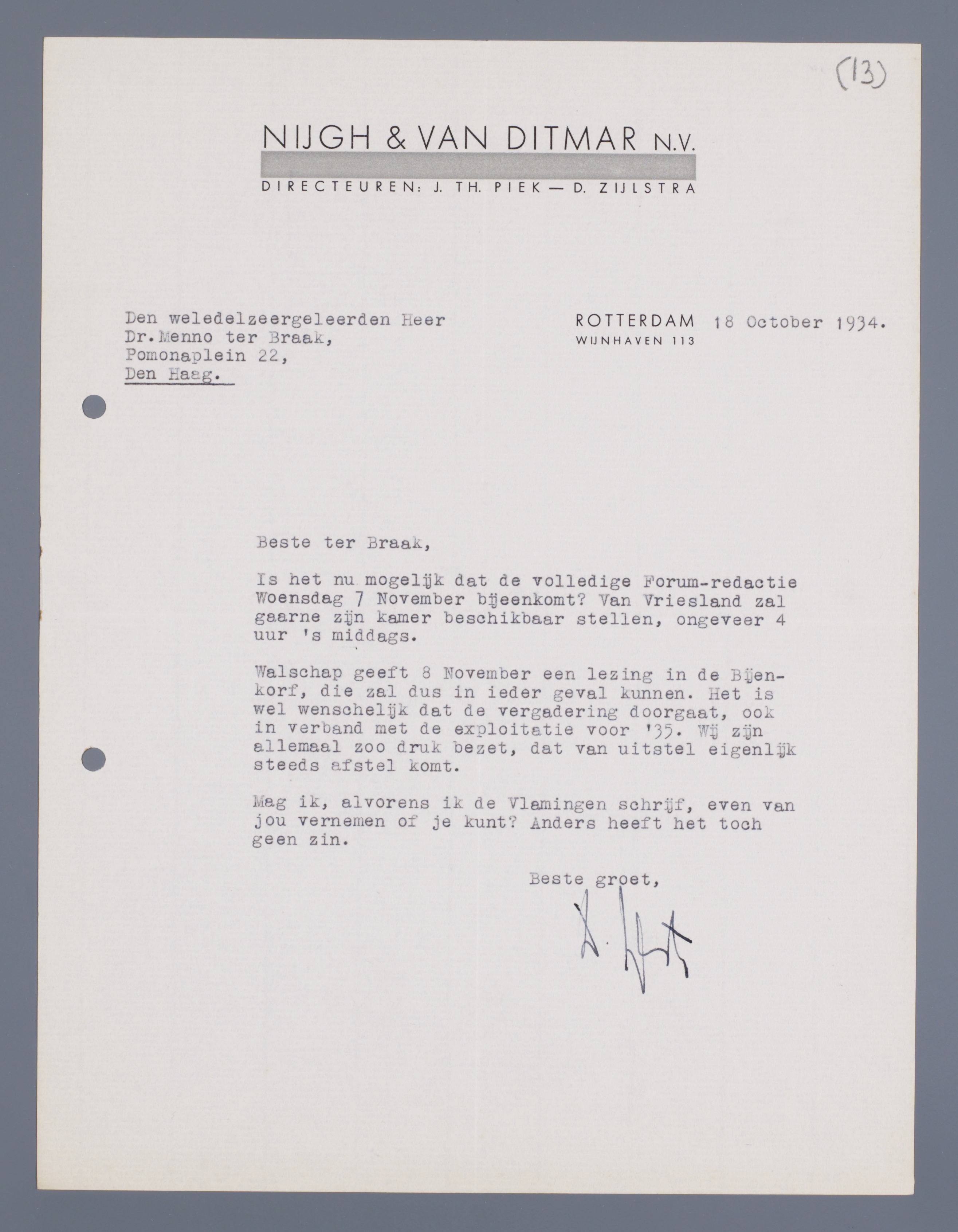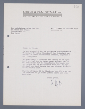 Is het nu mogelijk dat de volledige Forum-redactie Woensdag 7 November bijeenkomt? Van Vriesland zal gaarne zijn kamer beschikbaar stellen, ongeveer 4 uur 's middags.