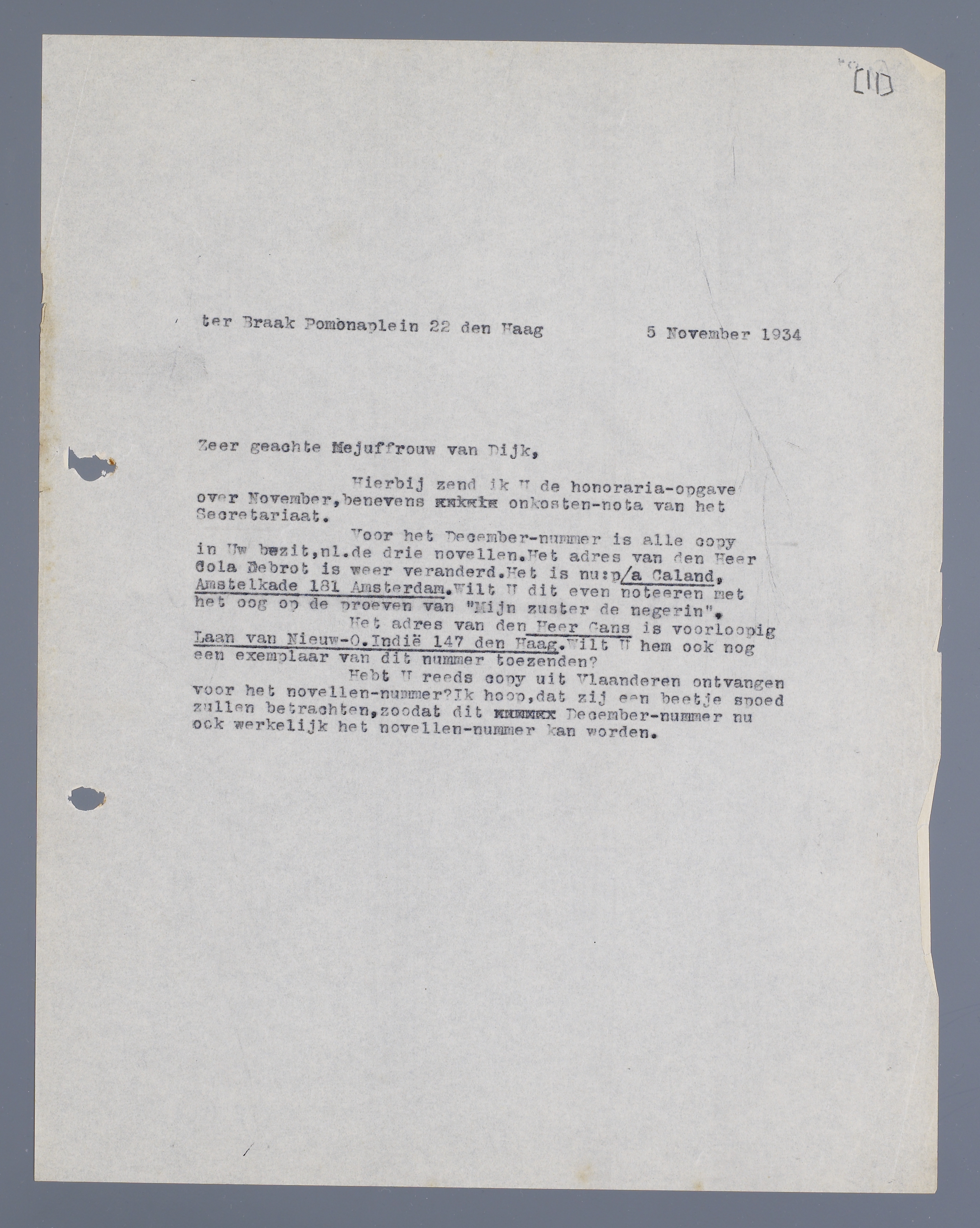 Voor december-nummer is alle copy in Uw bezit, nl. de drie novellen. Het adres van den heer Cola Debrot is weer veranderd. Het is nu: p\a Caland, Amstelkade 181 Amsterdam. Wilt U dit even noteeren met het oog op de proeven van ‘Mijn zuster de negerin’.