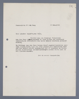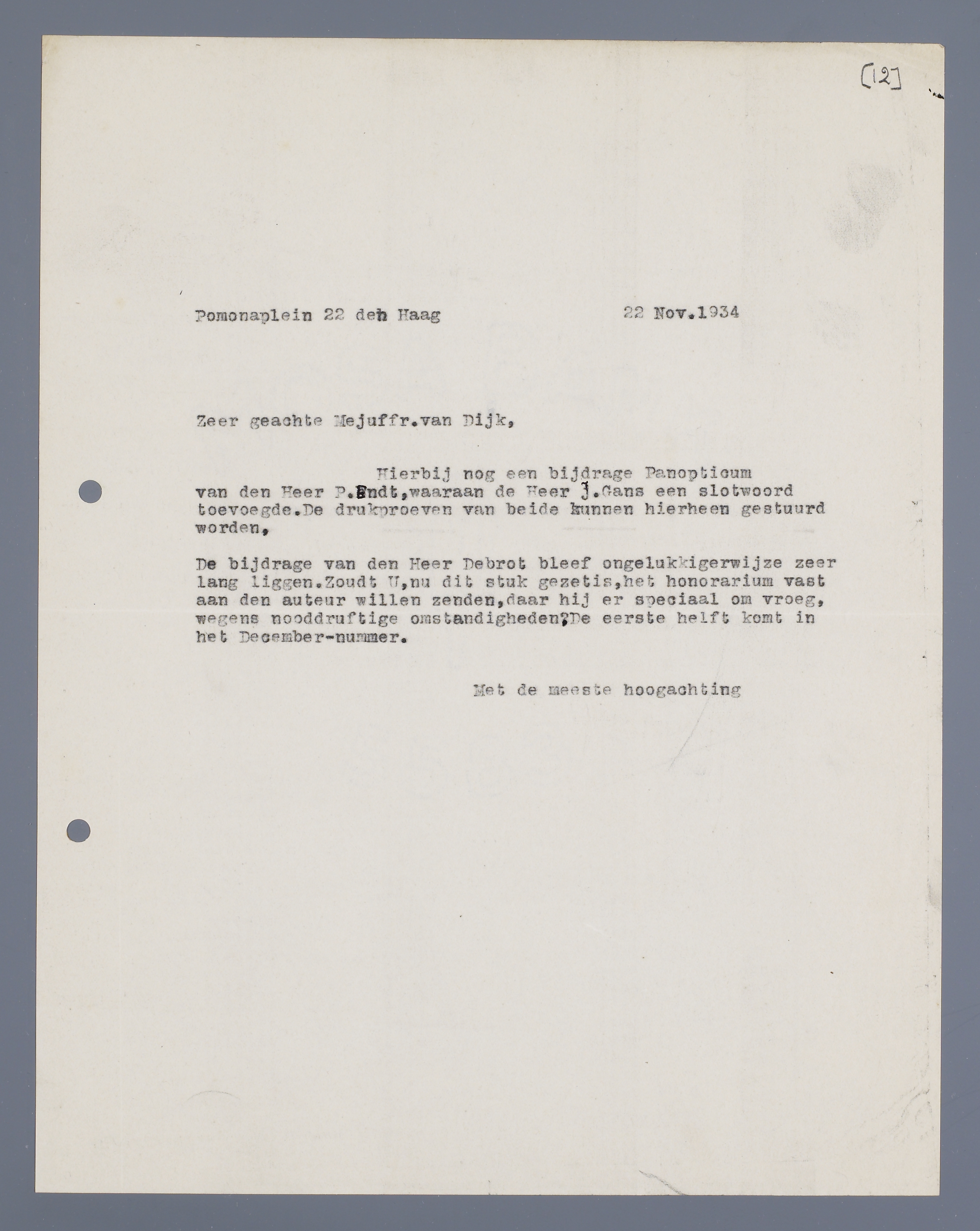 De bijdrage van den Heer Debrot bleef ongelukkigerwijze zeer lang liggen. Zoudt u, nu dit stuk gezet is, het honorarium vast aan den auteur willen zenden, daar hij er speciaal om vroeg, wegens nooddruftige omstandigheden? De eerste helft komt in het December-nummer.