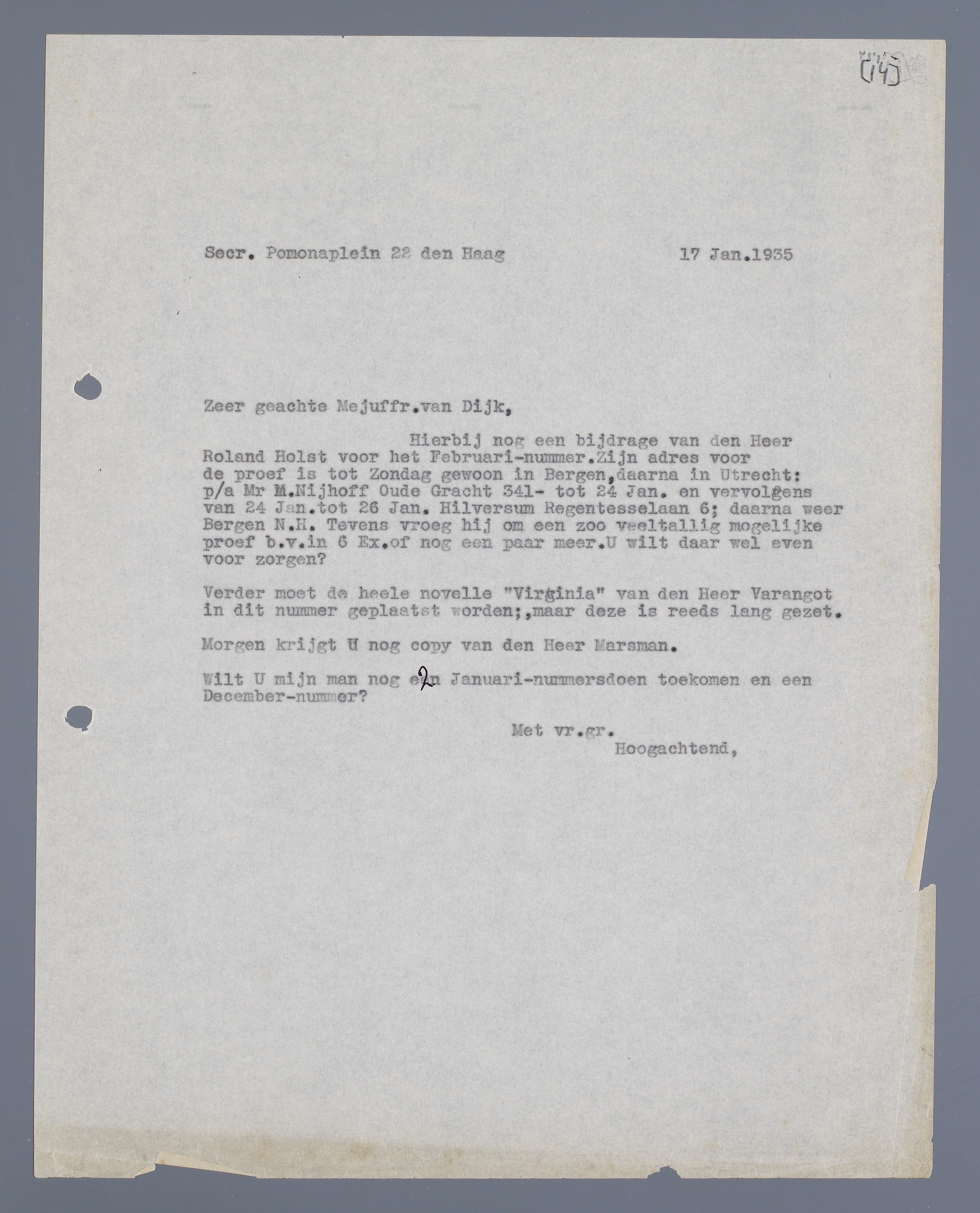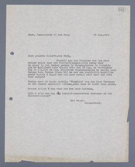 Hierbij nog een bijdrage van den Heer Roland Holst voor het Februari-nummer. Zijn adres voor de proef is tot Zondag gewoon in Bergen, daarna in Utrecht: p/a Mr M. Nijhoff Oude Gracht 341- tot 24 Jan. en vervolgens van 24 Jan. tot 26 Jan. Hilversum Regentesselaan 6; daarna weer Bergen N.H. Tevens vroeg hij om een zoo veeltallig mogelijke proef b.v. in 6 Ex. of nog een paar meer. U wilt daar wel even voor zorgen?