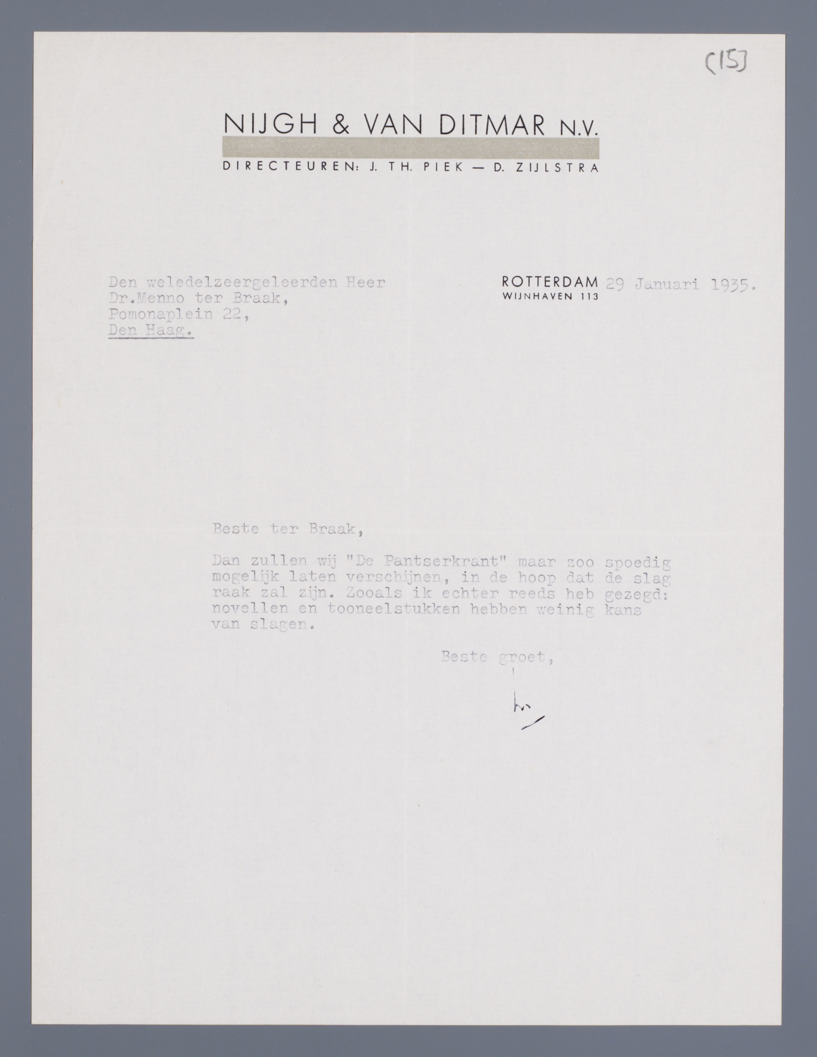 Dan zullen wij De Pantserkrant maar zoo spoedig mogelijk laten verschijnen, in de hoop dat de slag raak zal zijn. Zooals ik echter reeds heb gezegd: novellen en tooneelstukken hebben weinig kans van slagen.