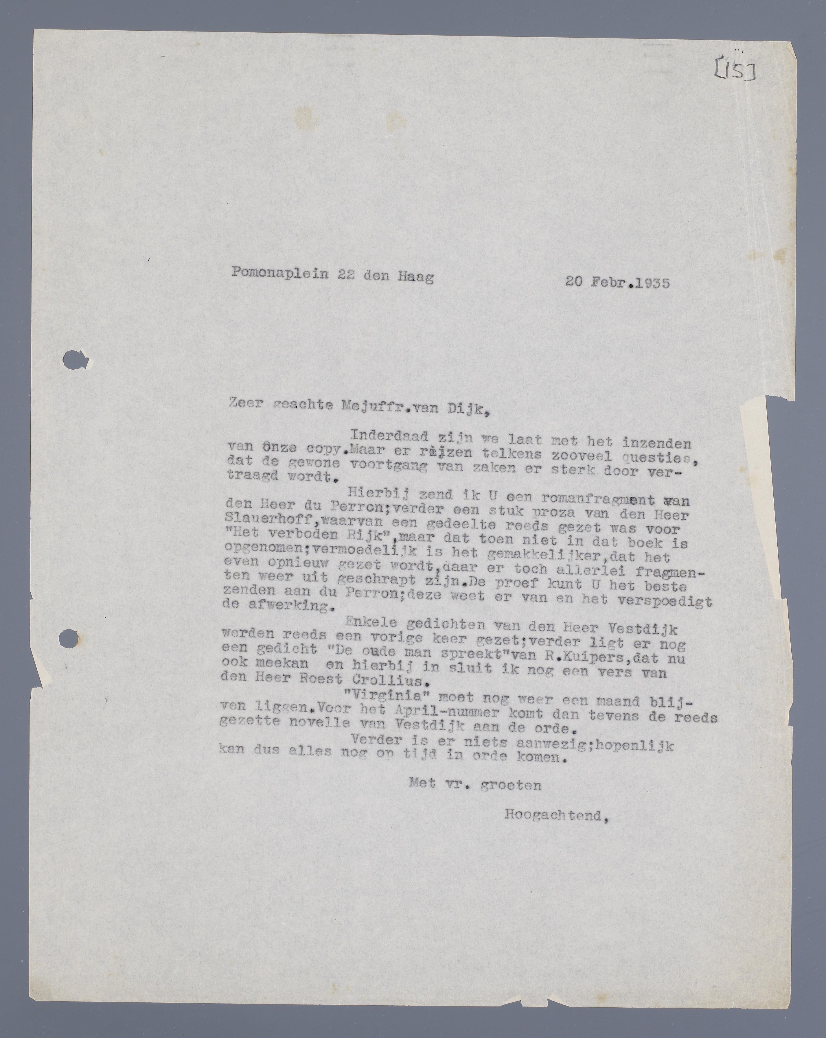 Hierbij zend ik U een romanfragment van den Heer du Perron; verder een stuk proza van den Heer Slauerhoff, waarvan een gedeelte reeds gezet was voor ‘Het verboden Rijk’, maar dat toen niet in dat boek is opgenomen; vermoedelijk is het gemakkelijker, dat het even opnieuw gezet wordt, daar er toch allerlei fragmenten weer uit geschrapt zijn. De proef kunt U het beste zenden aan du Perron; deze weet er van en het verspoedigt de afwerking.