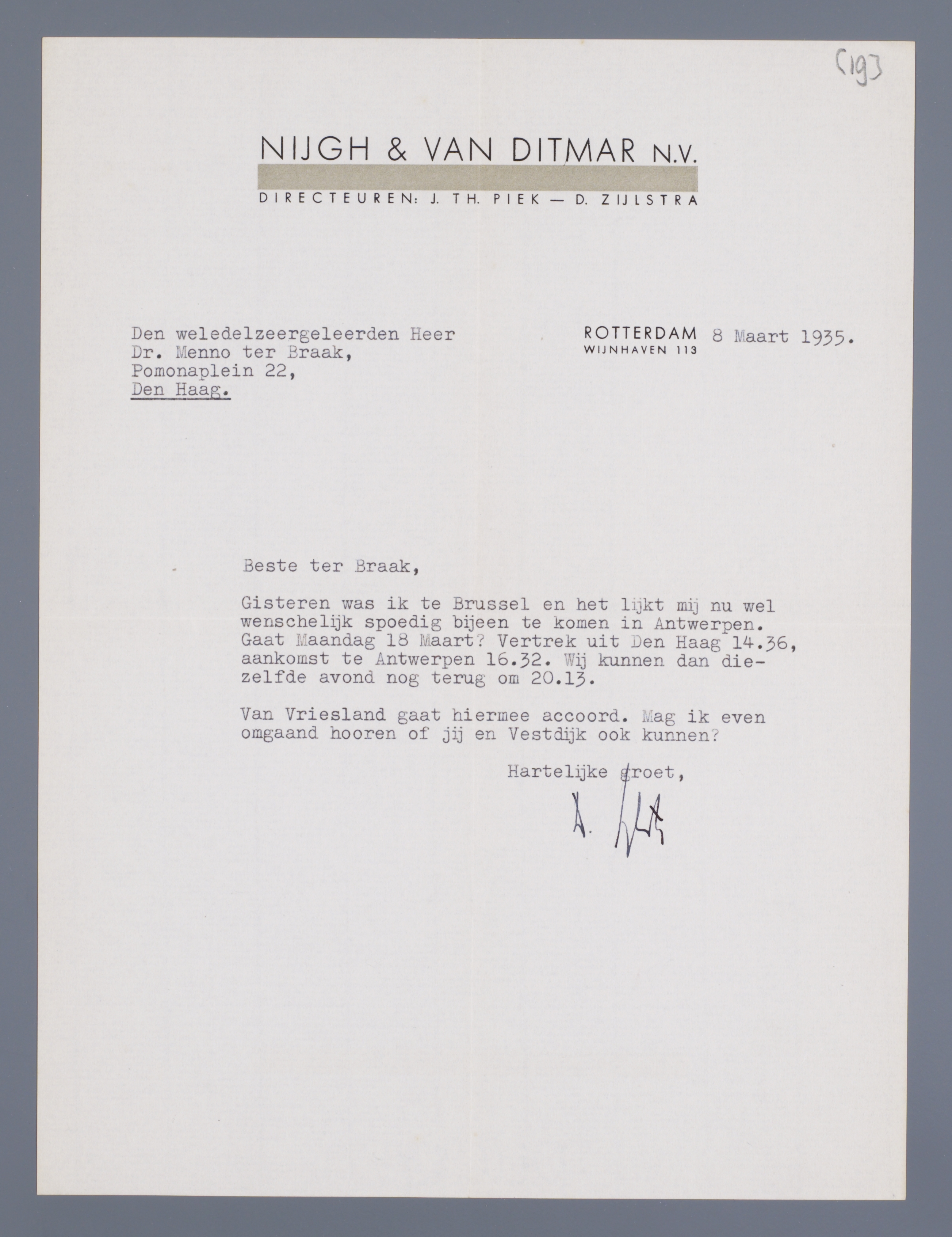 Gisteren was ik te Brussel en het lijkt mij nu wel wenschelijk spoedig bijeen te komen in Antwerpen. Gaat Maandag 18 Maart? Vertrek uit Den Haag 14.36, aankomst te Antwerpen 16.32. Wij kunnen dan diezelfde avond nog terug om 20.13.
