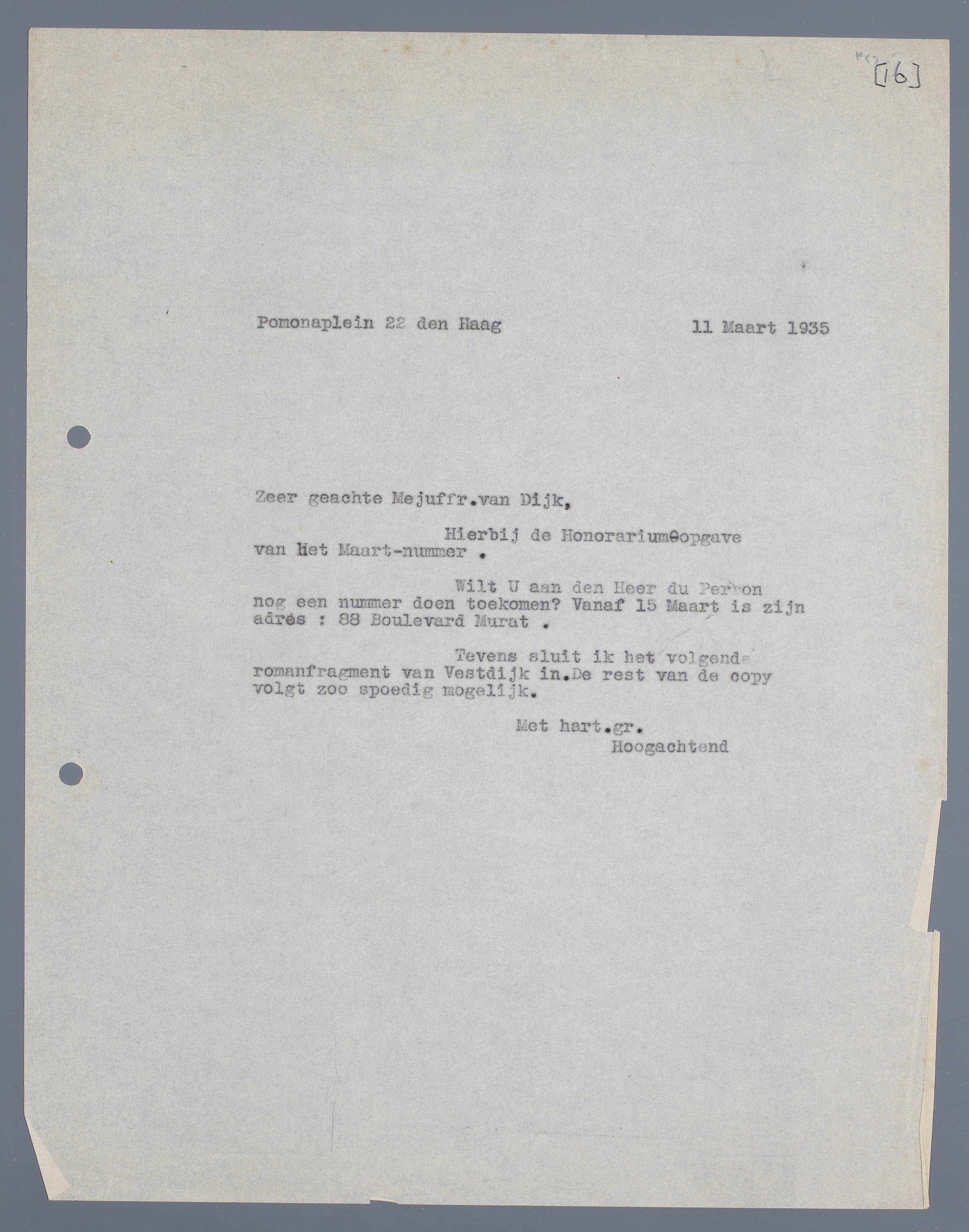 Wilt U aan den Heer du Perron nog een nummer doen toekomen? Vanaf 15 Maart is zijn adres: 88 Boulevard Murat.