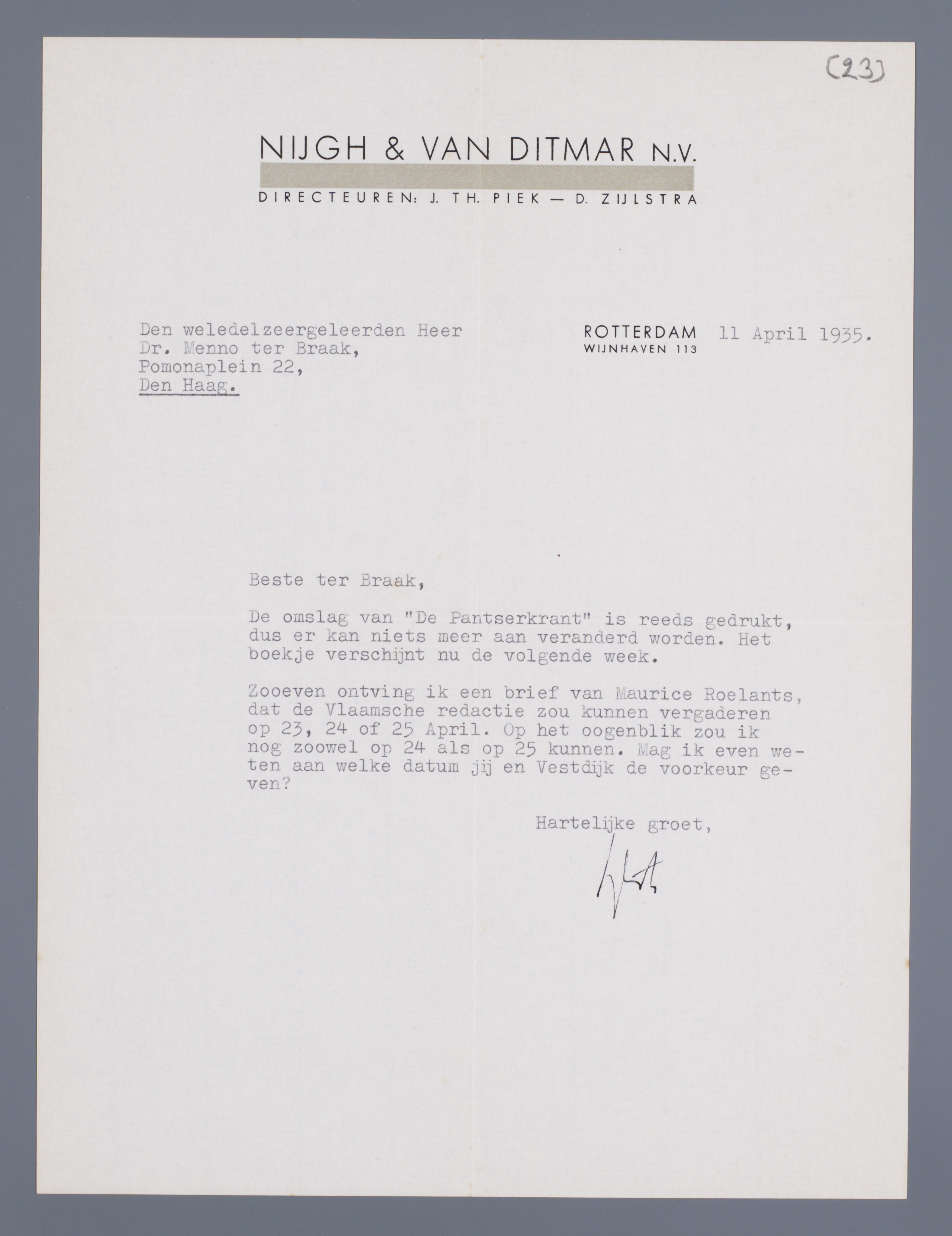 Zooeven ontving ik een brief van Maurice Roelants, dat de Vlaamsche redactie zou kunnen vergaderen op 23, 24 of 25 April. Op het oogenblik zou ik nog zoowel op 24 als op 25 kunnen. Mag ik even weten aan welke datum jij en Vestdijk de voorkeur geven?