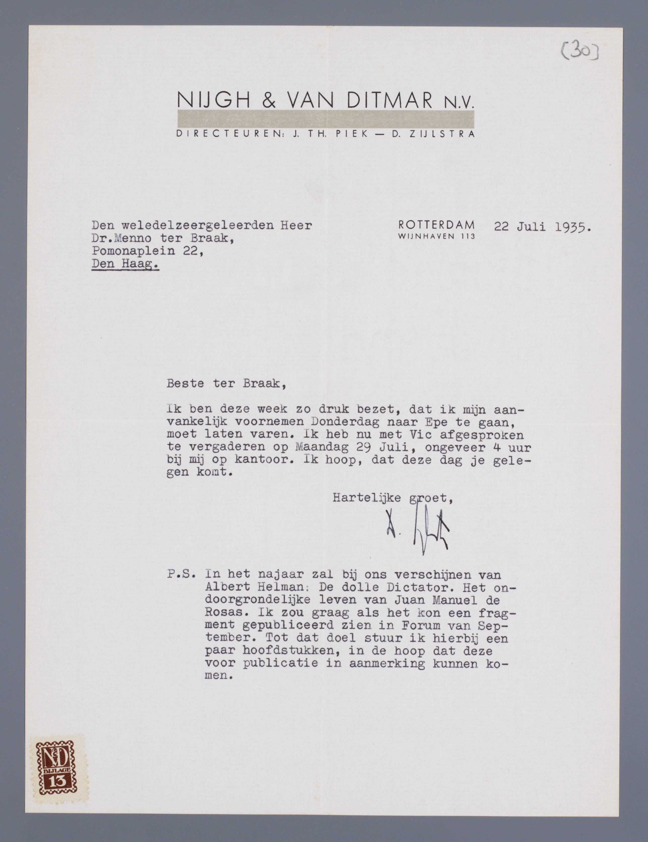 P.S. In het najaar zal bij ons verschijnen van Albert Helman: De dolle Dictator. Het ondoorgrondelijke leven van Juan Manuel de Rosas. Ik zou graag als het kon een fragment gepubliceerd zien in Forum van September. Tot dat doel stuur ik hierbij een paar hoofdstukken, in de hoop dat deze voor publicatie in aanmerking kunnen komen.