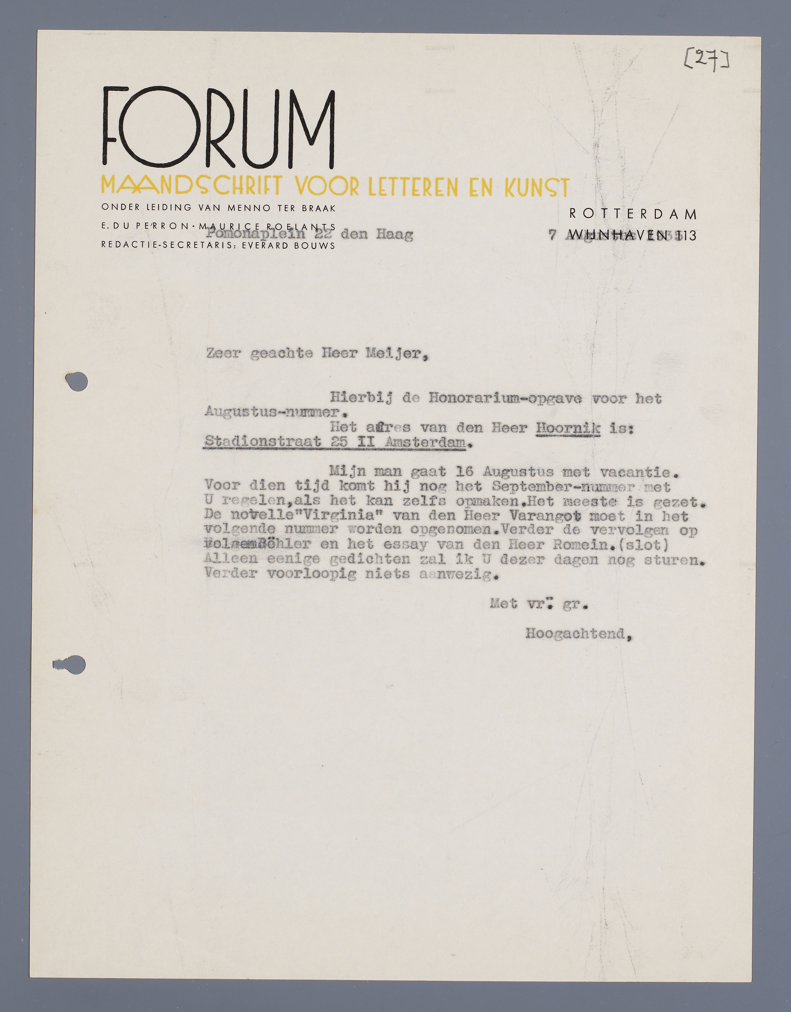 Mijn man gaat 16 Augustus met vacantie. Voor dien tijd komt hij nog het September-nummer met U regelen, als het kan zelfs opmaken. Het meeste is gezet. De novelle ‘Virginia’ van den Heer Varangot moet in het volgende nummer worden opgenomen. Verder de vervolgen op Böhler en het essay van den Heer Romein. (slot) Alleen eenige gedichten zal ik U dezer dagen nog sturen. Verder voorloopig niets aanwezig.