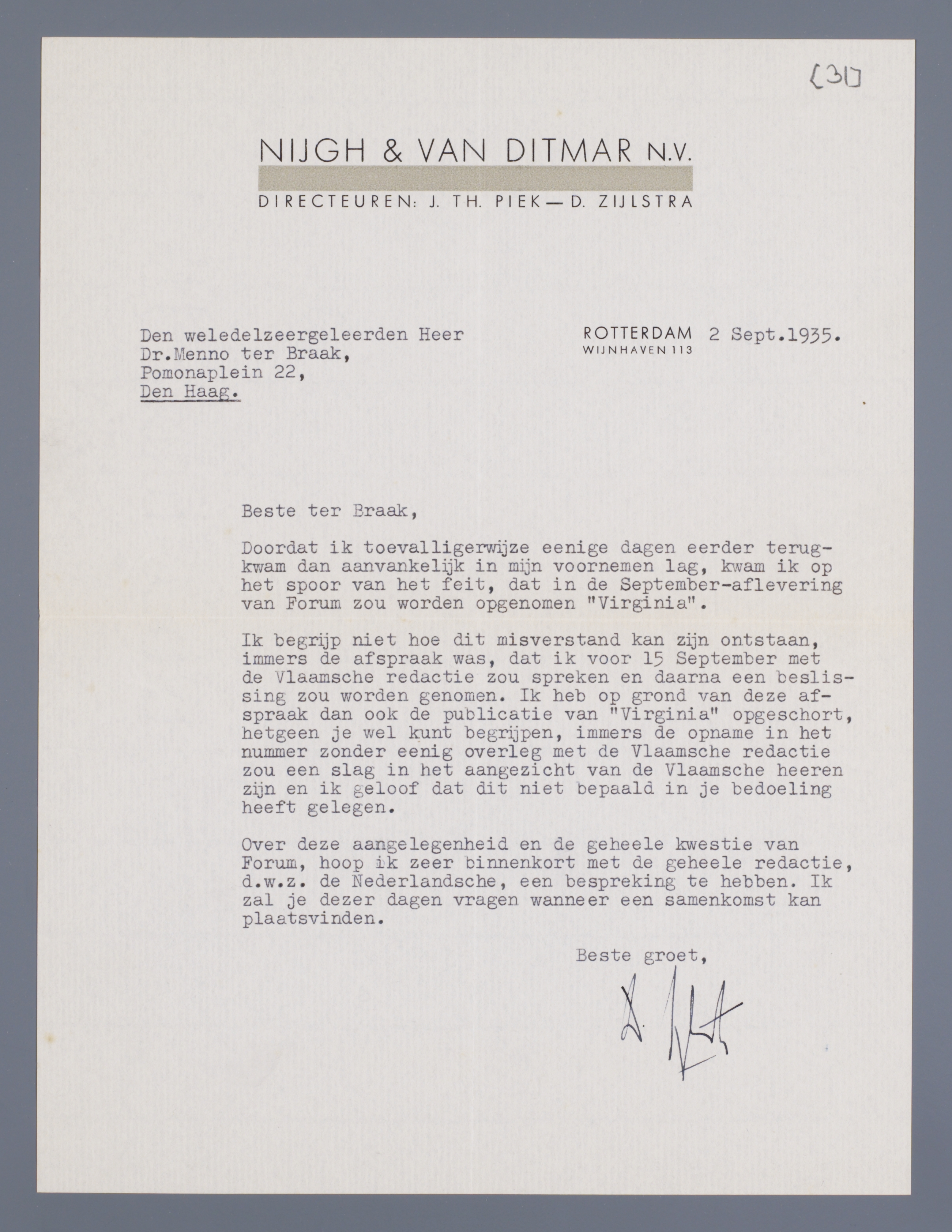 Ik begrijp niet hoe dit misverstand kan zijn ontstaan, immers de afspraak was, dat ik voor 15 September met de Vlaamsche redactie zou spreken en daarna een beslissing zou worden genomen. Ik heb op grond van deze afspraak dan ook de publicatie van Virginia' opgeschort, hetgeen je wel kunt begrijpen, immers de opname in het nummer zonder eenig overleg met de Vlaamsche redactie zou een slag in het aangezicht van de Vlaansche heeren zijn en ik geloof dat dit niet bepaald in je bedoeling heeft gelegen.