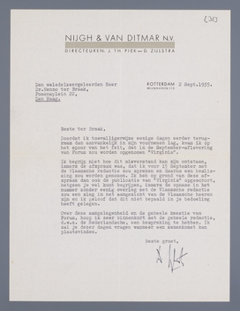 Over deze aangelegenheid en de geheele kwestie van Forum, hoop ik zeer binnenkort met de geheele redactie, d.w.z. de Nederlandsche, een bespreking te hebben. Ik zal je dezer dagen vragen wanneer er een samenkomst kan plaatsvinden.