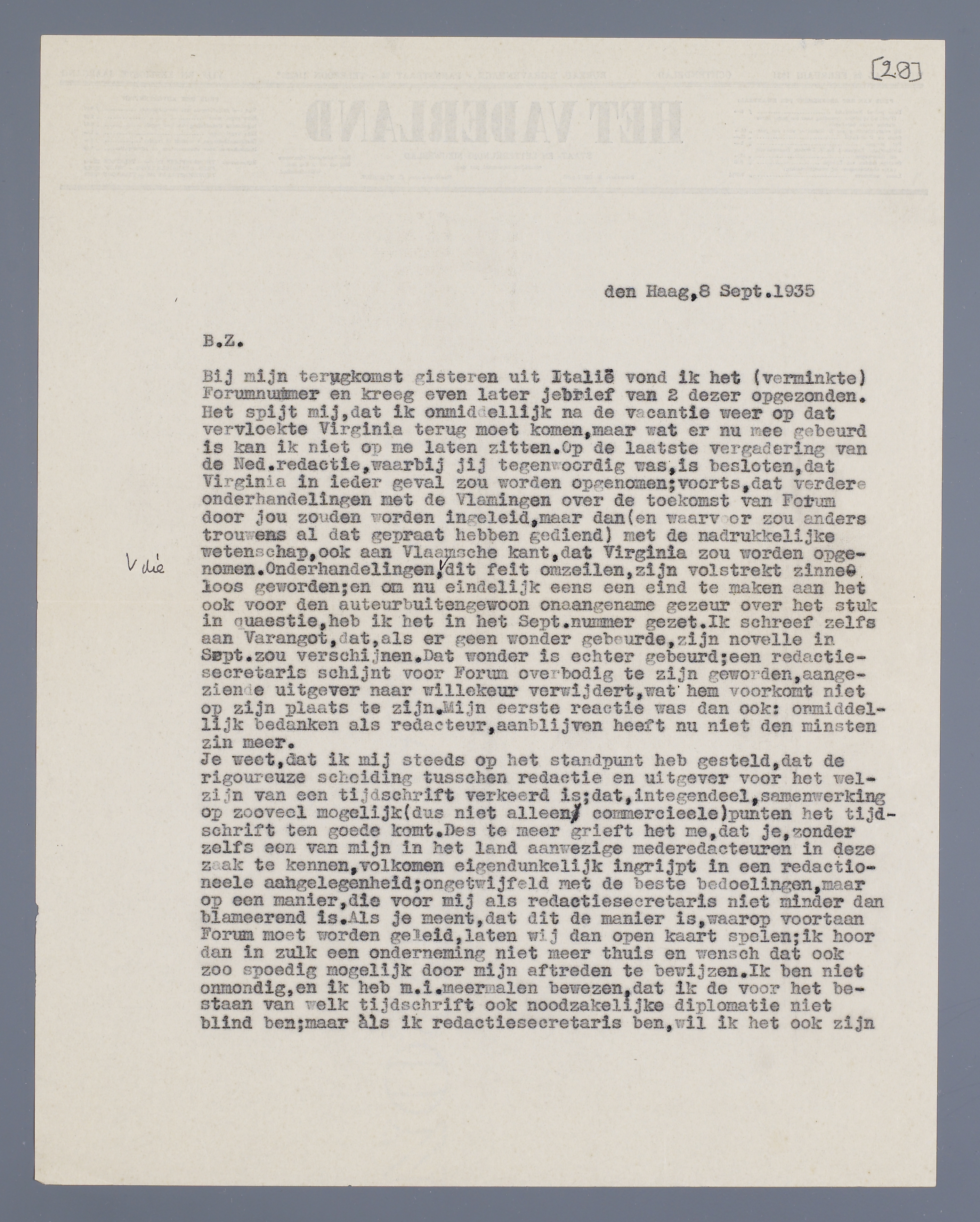 Ik wil echter, op grond van de prettige relaties, die er steeds tusschen ons bestaan hebben, aannemen, dat je geen opzettelijke belediging of zelfs maar kleinering van mijn werkzaamheid als redactiesecretaris hebt bedoeld. Na een nacht slapen kom ik dus van mijn plan om direct en definitief te bedanken terug; als Virginia in October geplaatst wordt, is de zaak voor mij ‘erledigt’. Maar één ding wil ik, ter voorkoming van misverstanden nog even duidelijk stipuleren: onder geen voorwaarde begin ik weer met de Vlamingen te onderhandelen over Virginia. Mochten V. en v.V. daar onverhoopt voor voelen, dan ga ik in October heen als redacteur, dat staat voor mij onherroepelijk vast. Ik heb een plan om Forum op andere wijze voort te zetten, als de Vlamingen (wat ik verwacht) zich terugtrekken; maar het heeft alleen zin, dat ter tafel te brengen, als de zaak Virginia met de voor ons verantwoorde zuiverheid is opgelost.