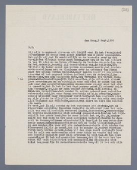 Bij mijn terugkomst gisteren uit Italië vond ik het (verminkte) Forumnummer en kreeg even later je brief van 2 dezer opgezonden. Het spijt mij, dat ik onmiddellijk na de vacantie weer op dat vervloekte Virginia terug moet komen, maar wat er nu mee gebeurd is kan ik niet op me laten zitten. Op de laatste vergadering van de Ned. redactie, waarbij jij tegenwoordig was, is besloten, dat Virginia in ieder geval zou worden opgenomen; voorts, dat verdere onderhandelingen met de Vlamingen over de toekomst van Forum door jou zouden worden ingeleid, maar dan (en waarvoor zou anders trouwens al dat gepraat hebben gediend) met de nadrukkelijke wetenschap, ook aan Vlaamsche kant, dat Virginia zou worden opgenomen. Onderhandelingen, die dit feit omzeilen, zijn volstrekt zinneloos geworden; en om nu eindelijk eens een eind te maken aan het ook voor den auteur buitengewoon onaangename gezeur over het stuk in quaestie, heb ik het in het Sept. nummer gezet. Ik schreef zelfs aan Varangot, dat, als er geen wonder gebeurde, zijn novelle in Sept. zou verschijnen. Dat wonder is echter gebeurd; een redactiesecretaris schijnt voor Forum overbodig te zijn geworden, aangezien de uitgever naar willekeur verwijdert, wat hem voorkomt niet op zijn plaats te zijn. Mijn eerste reactie was dan ook: onmiddellijk bedanken als redacteur, aanblijven heeft nu niet den minsten zin meer.