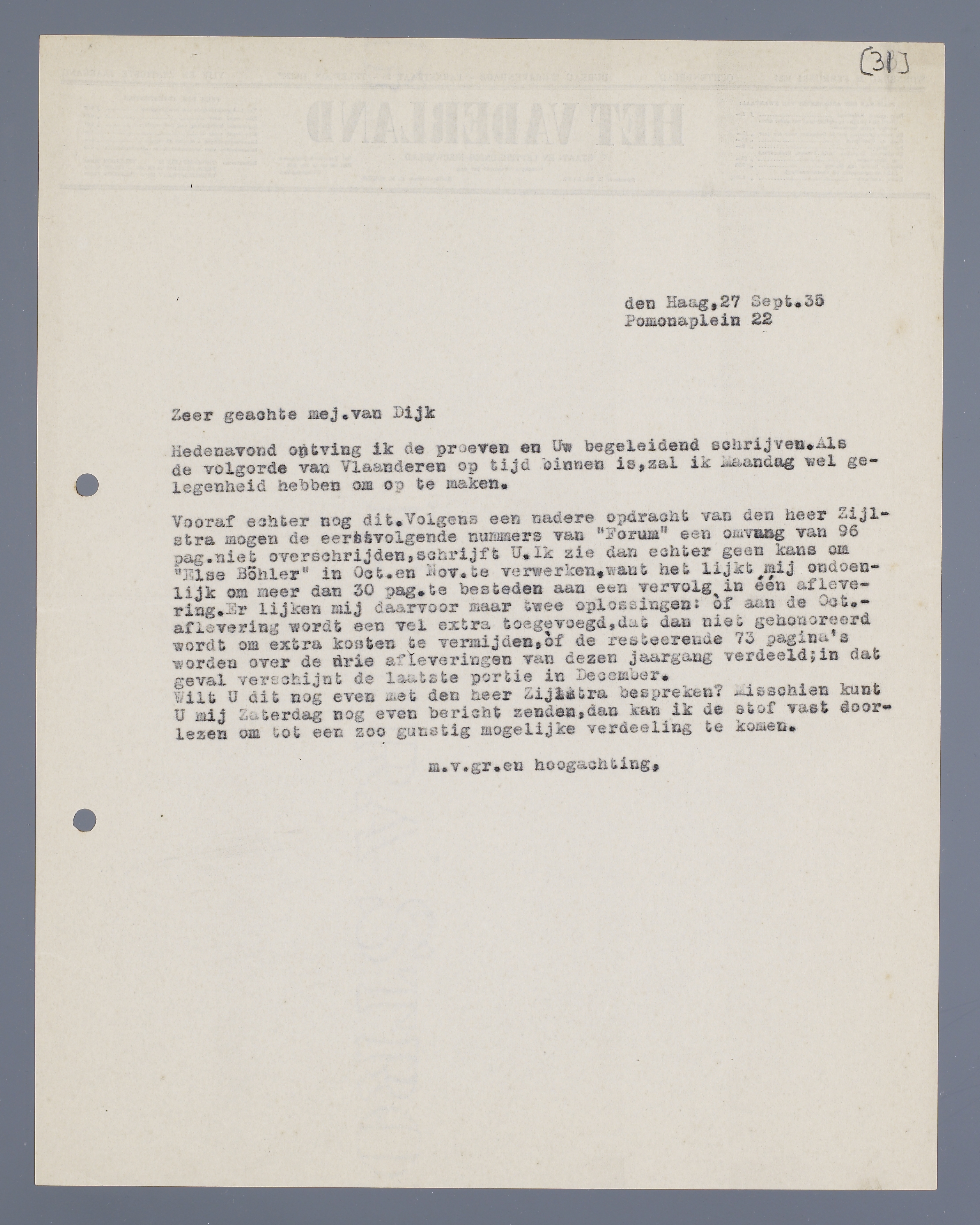 Vooraf echter nog dit. Volgens een nadere opdracht van den heer Zijlstra mogen de eerstvolgende nummers van ‘Forum’ een omvang van 96 pag. niet overschrijden, schrijft U. Ik zie dan echter geen kans om ‘Else Böhler’ in Oct. en Nov. te verwerken, want het lijkt mij ondoenlijk om meer dan 30 pag. te besteden aan een vervolg in één aflevering. Er lijken mij daarvoor maar twee oplossingen: òf aan de Oct. aflevering wordt een vel extra toegevoegd, dat dan niet gehonoreerd wordt om extra kosten te vermijden, òf de resteerende 73 pagina's worden over de drie afleveringen van dezen jaargang verdeeld; in dat geval verschijnt de laatste portie in December.