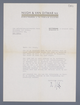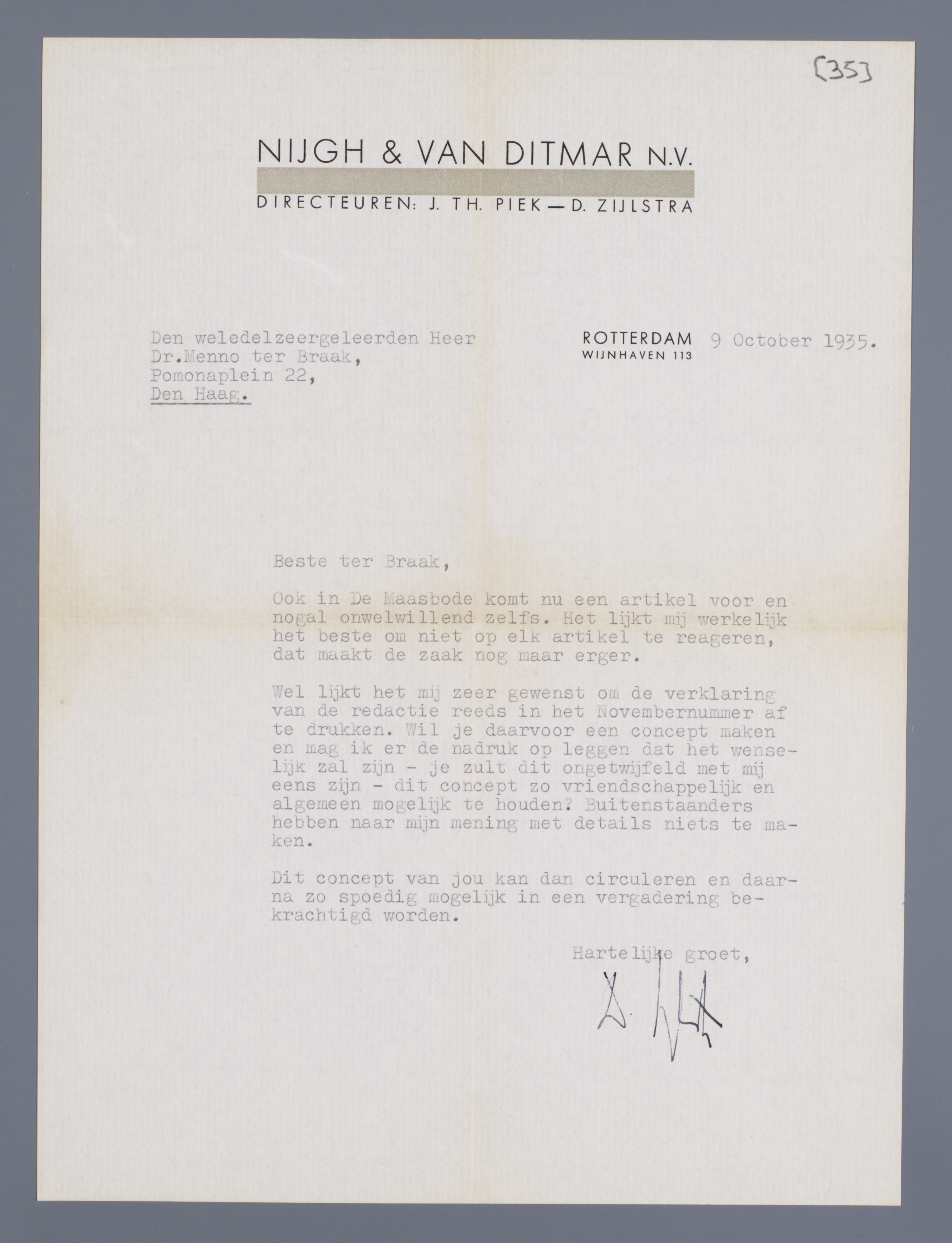 Wel lijkt het mij zeer gewenst om de verklaring van de redactie reeds in het Novembernummer af te drukken. Wil je daarvoor een concept maken en mag ik er de nadruk op leggen dat het wenselijk zal zijn - dit concept zo vriendschappelijk en algemeen mogelijk te houden? Buitenstaanders hebben naar mijn mening met details niets te maken.