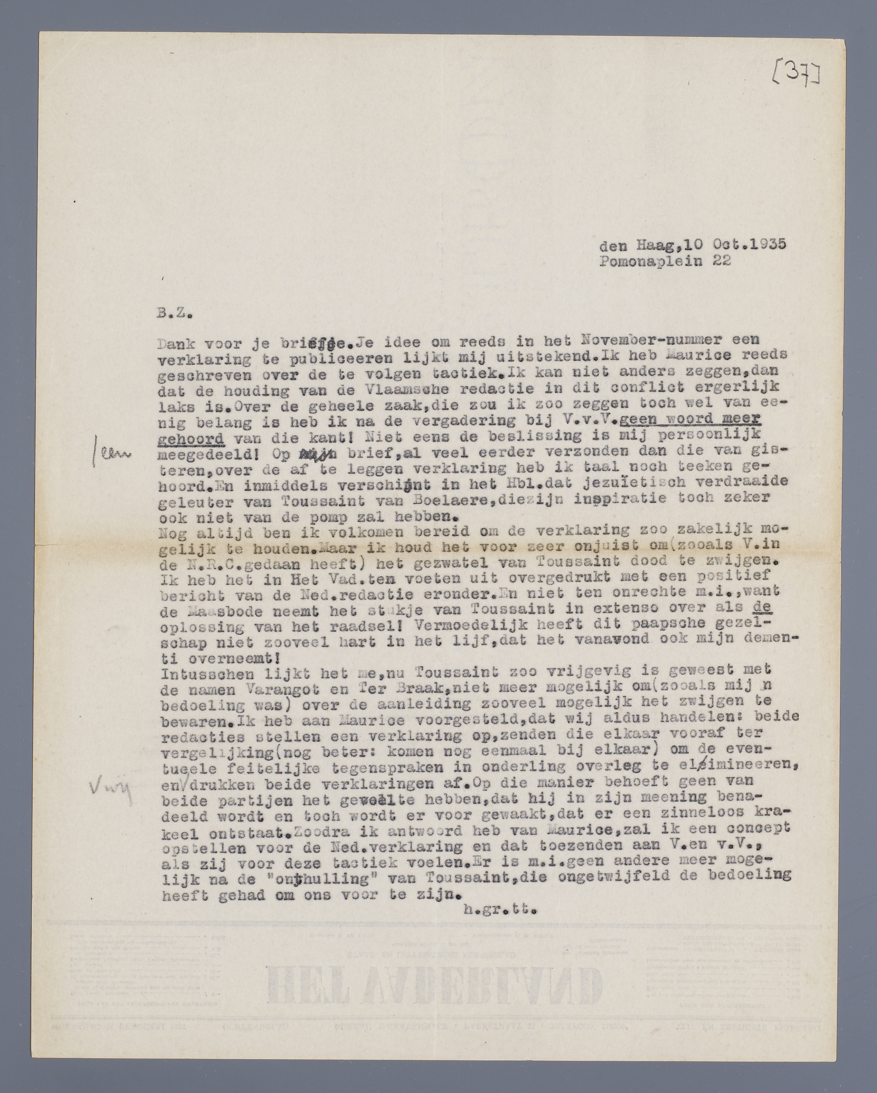 Intusschen lijkt het me, nu Toussaint zoo vrijgevig is geweest met de namen Varangot en Ter Braak, niet meer mogelijk om (zooals mijn bedoeling was) over de aanleiding zooveel mogelijk het zwijgen te bewaren. Ik heb aan Maurice voorgesteld, dat wij aldus handelen: beide redacties stellen een verklaring op, zenden die elkaar vooraf ter vergelijking (nog beter: komen nog eenmaal bij elkaar) om de eventueele feitelijke tegenspraken in onderling overleg te elimineeren, en wij drukken beide verklaringen af. Op die manier behoeft geen van beide partijen het gevoel te hebben, dat hij in zijn meening benadeeld wordt en toch wordt ervoor gewaakt, dat er een zinneloos krakeel ontstaat. Zoodra ik antwoord heb van Maurice, zal ik een concept opstellen voor de Ned. verklaring en dat toezenden aan V. en v.V., als zij voor deze tactiek voelen. Er is m.i. geen andere mogelijkheid na de ‘onthulling’ van Toussaint, die ongetwijfeld de bedoeling heeft gehad om ons voor te zijn.