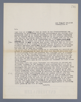 Dank voor je briefje. Je idee om reeds in het November-nummer een verklaring te publiceeren lijkt mij uitstekeND. Ik heb Maurice reeds geschreven over de te volgen tactiek. Ik kan niet anders zeggen, dan dat de houding van de Vlaamsche redactie in dit conflict ergerlijk laks is. Over de geheele zaak, die zou ik zoo zeggen toch wel van eenig belang is heb ik na de vergadering bij V.v.V. geen woord meer gehoord van die kant! Niet eens de beslissing is mij persoonlijk meegedeeld! Op een brief, al veel eerder verzonden dan die van gisteren, over de af te leggen verklaring heb ik taal noch teeken gehoord. En inmiddels verschijnt in het Hbl. dat jezuïtische verdraaide geleuter van Toussaint van Boelaere, die zijn inspiratie toch zeker ook niet van de pomp zal hebben.