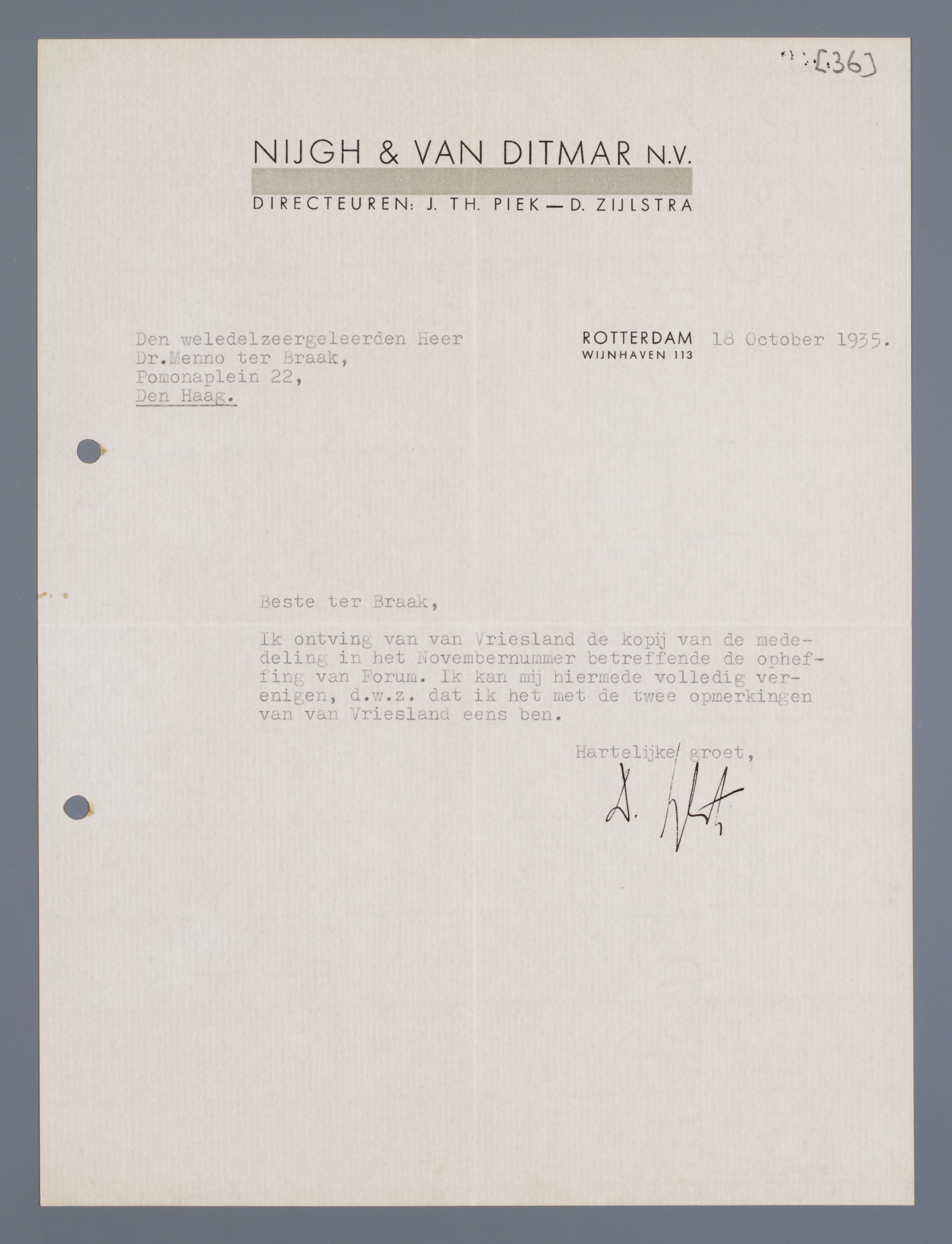 Ik ontving van van Vriesland de kopij van de mededeling in het Novembernummer betreffende de opheffing van Forum. Ik kan mij hiermede volledig verenigen, d.w.z. dat ik het met de twee opmerkingen van van Vriesland eens ben.