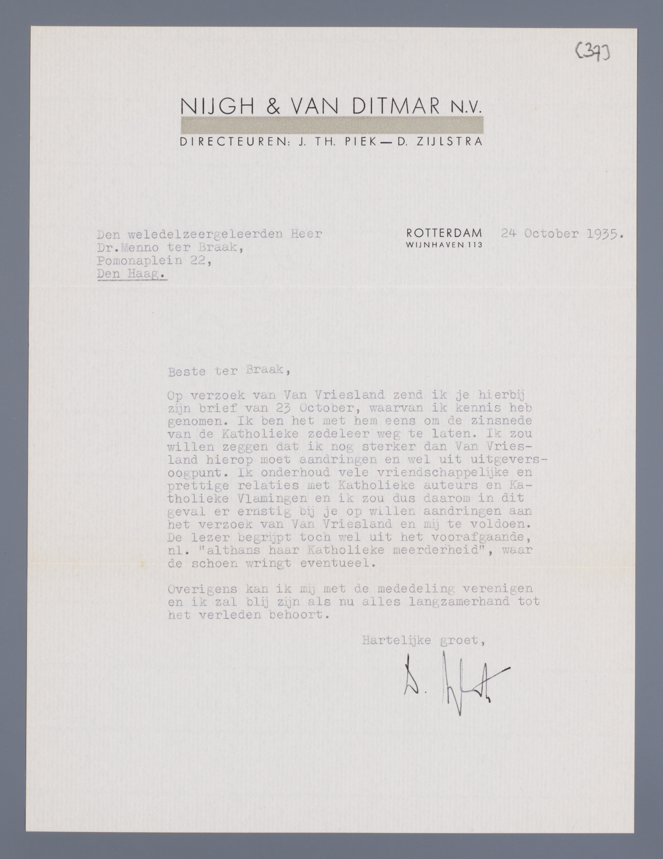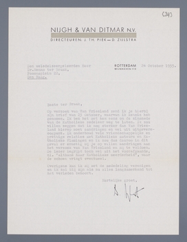 Op verzoek van Van Vriesland zend ik je hierbij zijn brief van 23 October, waarvan ik kennis heb genomen. Ik ben het met hem eens om de zinsnede van de Katholieke zedeleer weg te laten. Ik zou willen zeggen dat ik nog sterker dan Van Vriesland hierop moet aandringen en wel uit uitgeversoogpunt. Ik onderhoud vele vriendschappelijke en prettige relaties met Katholieke auteurs en Katholieke Vlamingen en ik zou dus daarom in dit geval er ernstig bij je op willen aandringen aan het verzoek van Van Vriesland en mij te voldoen. De lezer begrijpt toch wel uit het voorafgaande, nl. althans haar Katholieke meerderheid, waar de schoen wringt eventueel.