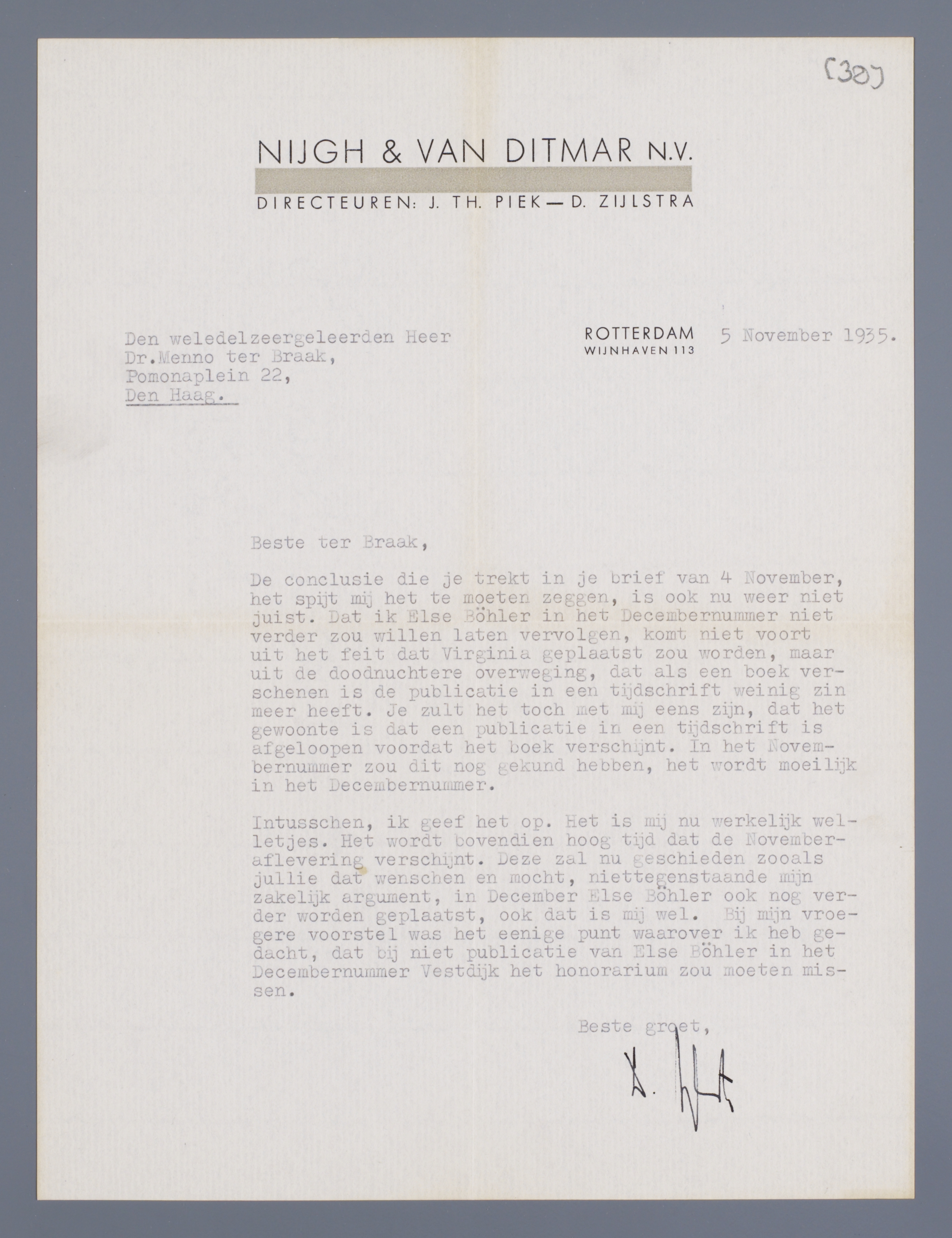 De conclusie die je trekt in je brief van 4 November, het spijt mij het te moeten zeggen, is ook nu weer niet juist. Dat ik Else Böhler in het Decembernummer niet verder zou willen laten vervolgen, komt niet voort uit het feit dat Virginia geplaatst zou worden, maar uit de doodnuchtere overweging, dat als een boek verschenen is de publicatie in een tijdschrift weinig zin meer heeft. Je zult het toch met mij eens zijn, dat het gewoonte is dat een publicatie in een tijdschrift is afgeloopen voordat het boek verschijnt. In het Novembernummer zou dit nog gekund hebben, het wordt moeilijk in het Decembernummer.