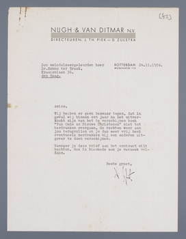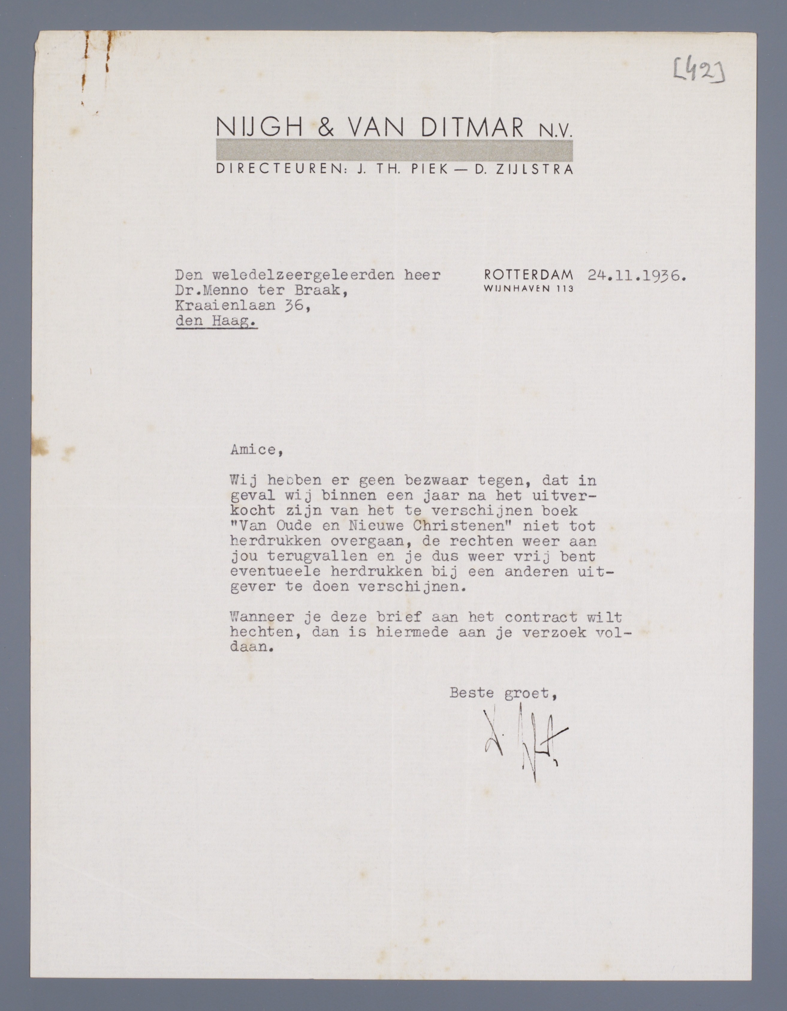 Wij hebben er geen bezwaar tegen, dat in geval wij binnen een jaar na het uitverkocht zijn van het te verschijnen boek ‘Van Oude en Nieuwe Christenen’ niet tot herdrukken overgaan, de rechten weer aan jou terugvallen en je dus weer vrij bent eventueele herdrukken bij een anderen uitgever te doen verschijnen.
