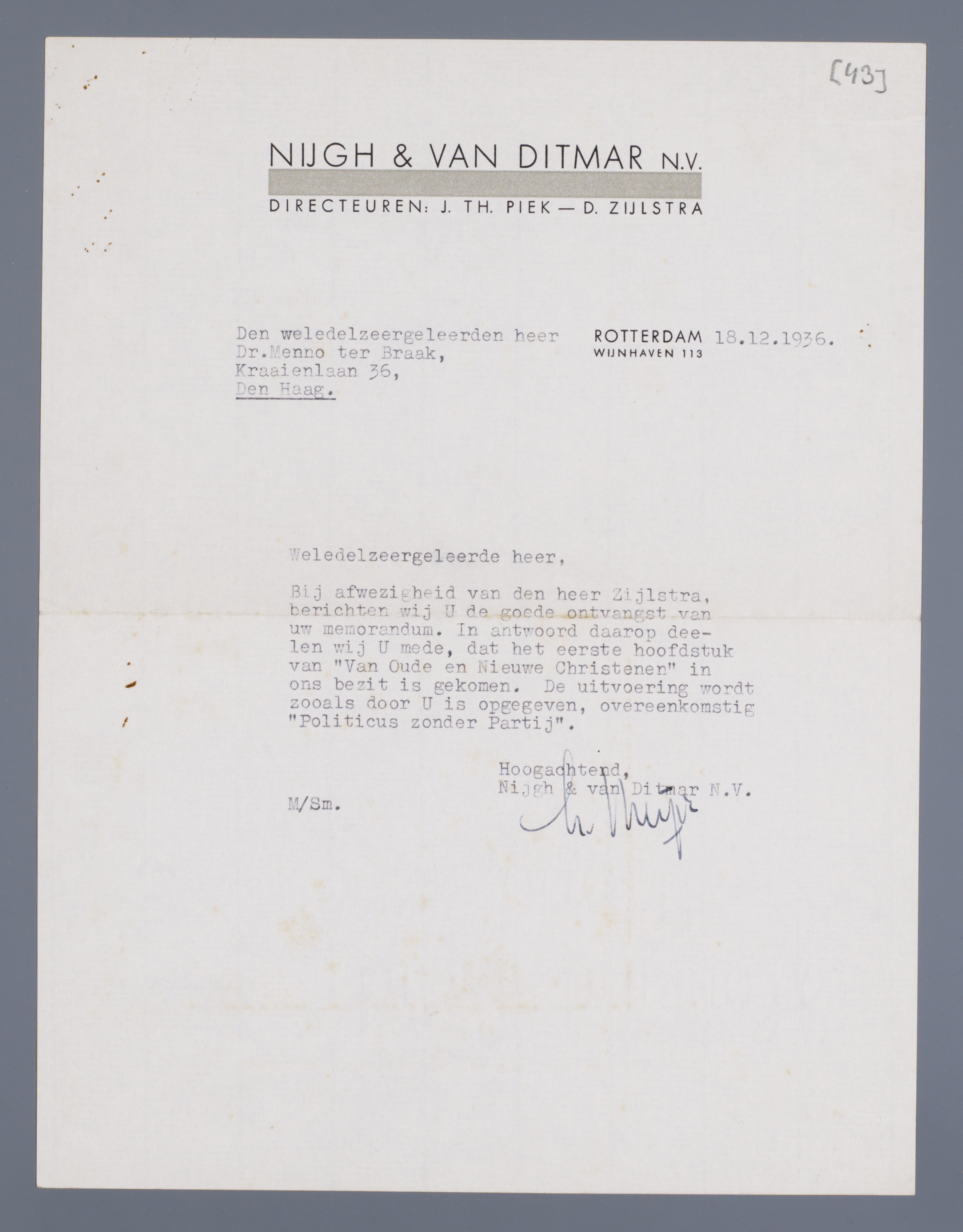 Bij afwezigheid van den heer Zijlstra, berichten wij U de goede ontvangst van uw memorandum. In antwoord daarop deelen wij U mede, dat het eerste hoofdstuk van ‘Van Oude en Nieuwe Christenen’ in ons bezit is gekomen. De uitvoering wordt zooals door U is opgegeven, overeenkomstig ‘Politicus zonder Partij’.