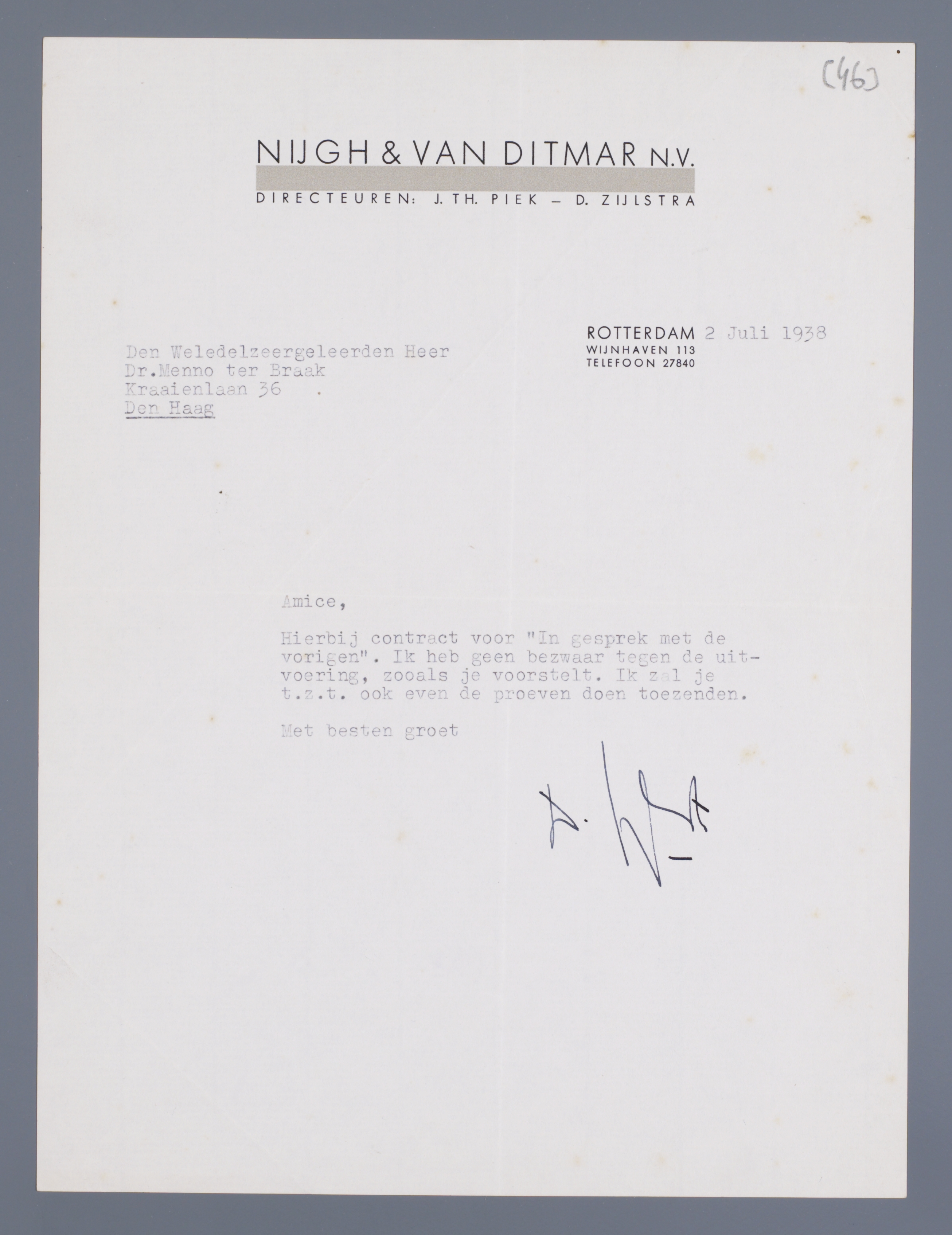 Hierbij contract voor ‘In gesprek met de vorigen’. Ik heb geen bezwaar tegen de uitvoering, zooals je die voorstelt. Ik zal je t.z.t. ook even de proeven doen toezenden.