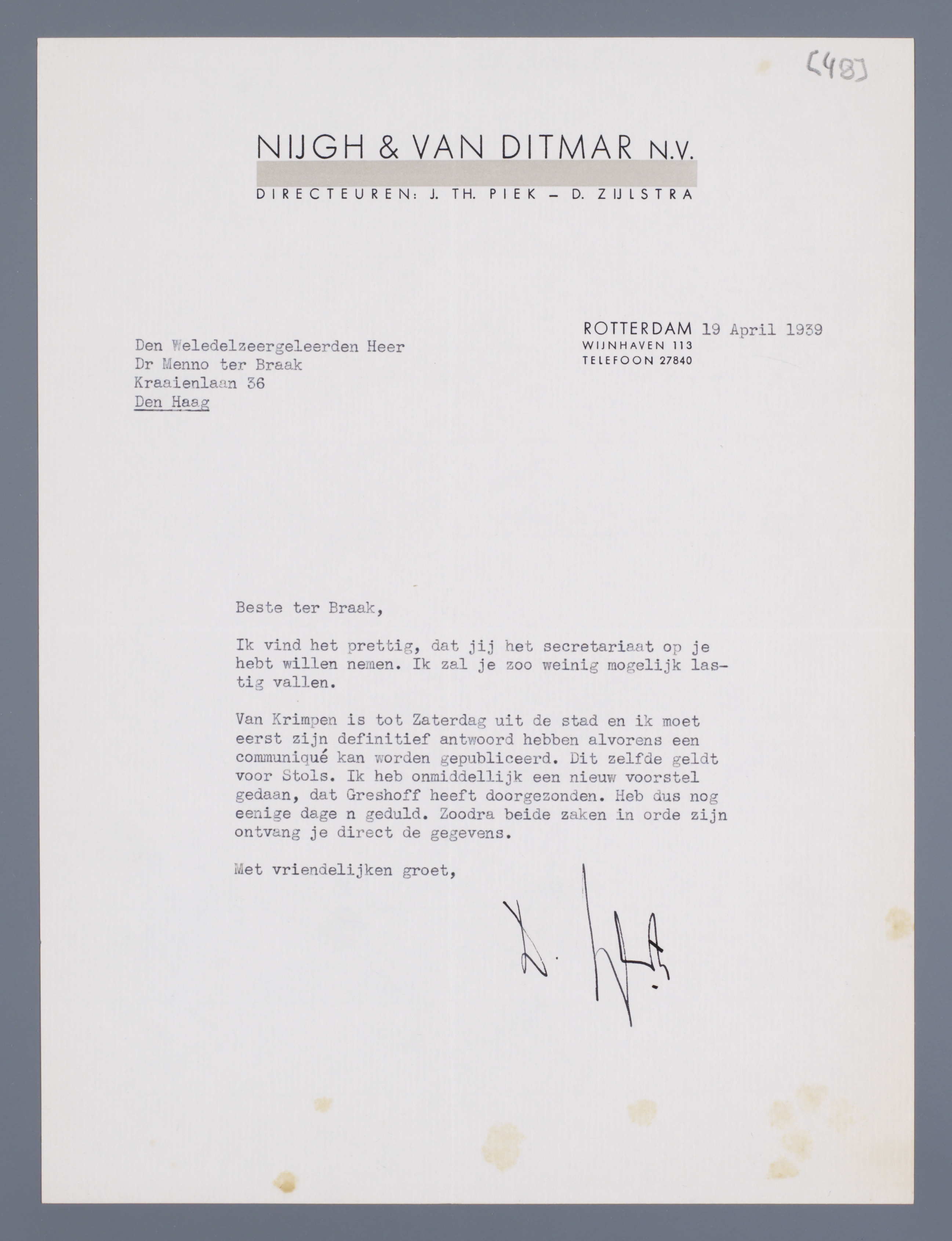 Van Krimpen is tot Zaterdag uit de stad en ik moet eerst zijn definitief antwoord hebben alvorens een communiqué kan worden gepubliceerd. Dit zelfde geldt voor Stols. Ik heb onmiddellijk een nieuw voorstel gedaan, dat Greshoff heeft doorgezonden. Heb dus nog eenige dagen geduld. Zoodra beide zaken in orde zijn ontvang je direct de gegevens.