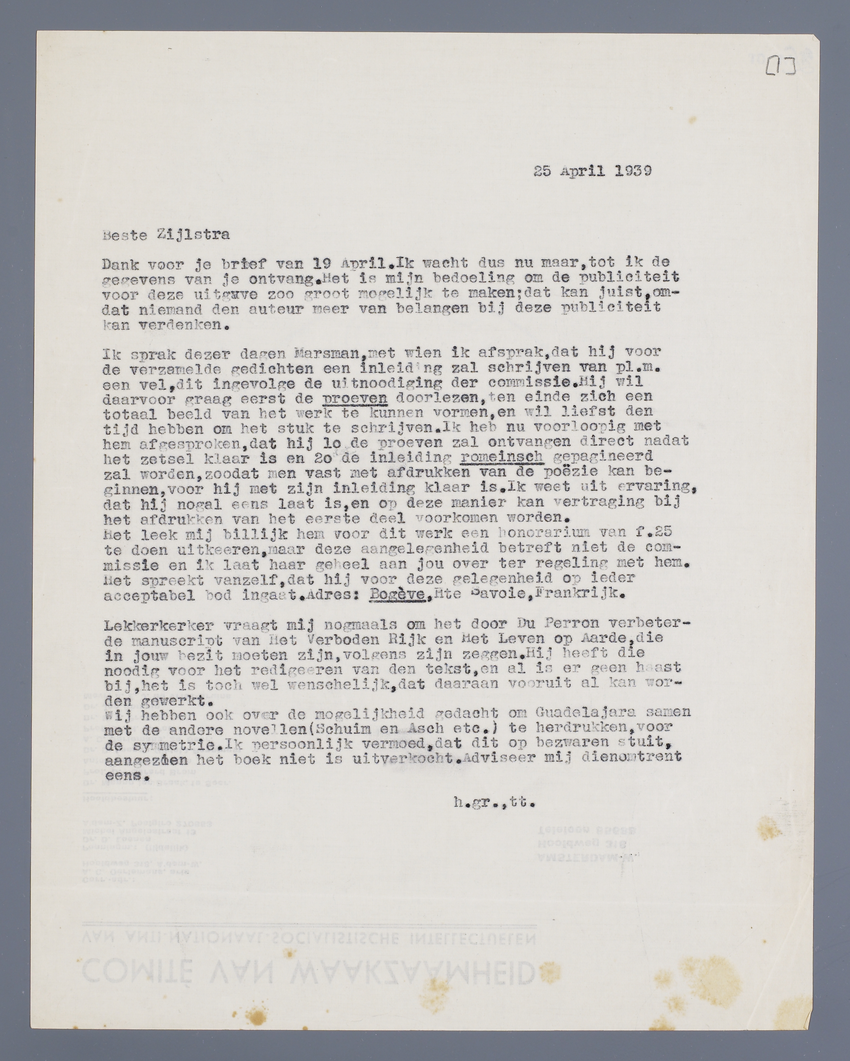 Ik sprak dezer dagen Marsman, met wien ik afsprak, dat hij voor de verzamelde gedichten een inleiding zal schrijven van pl.m. een vel, dit ingevolge de uitnoodiging der commissie. Hij wil daarvoor graag eerst de proeven doorlezen, ten einde zich een totaal beeld van het werk te kunnen vormen, en wil liefst den tijd hebben om het stuk te schrijven. Ik heb nu voorloopig met hem afgesproken, dat hij 1o de proeven zal ontvangen direct nadat het zetsel klaar is en 2o de inleiding romeinsch gepagineerd zal worden, zoodat men vast met afdrukken van de poëzie kan beginnen, voordat hij met zijn inleiding klaar is. Ik weet uit ervaring, dat hij nogal eens laat is, en op deze manier kan vertraging bij het afdrukken van het eerste deel voorkomen worden.