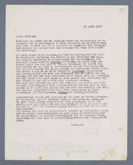 Dank voor je brief van 19 April. Ik wacht nu dus maar, tot ik de gegevens van je ontvang. Het is mijn bedoeling om de publiciteit voor deze uitgave zoo groot mogelijk te maken; dat kan juist, omdat niemand den auteur meer van belangen bij deze publiciteit kan verdenken.