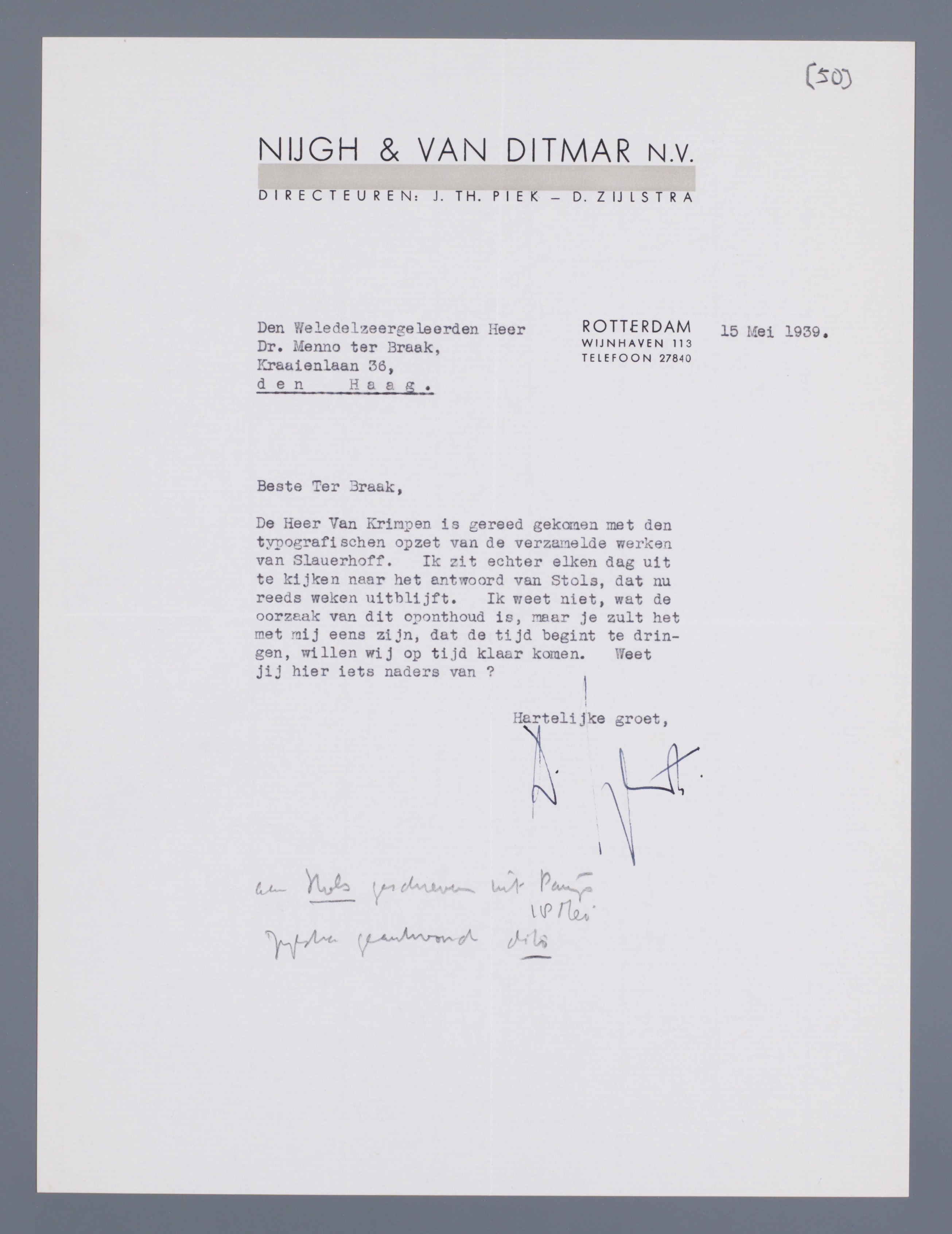 [aantekening van Ter Braak:] aan Stols geschreven uit Parijs 18 Mei, Zijlstra geantwoord dito