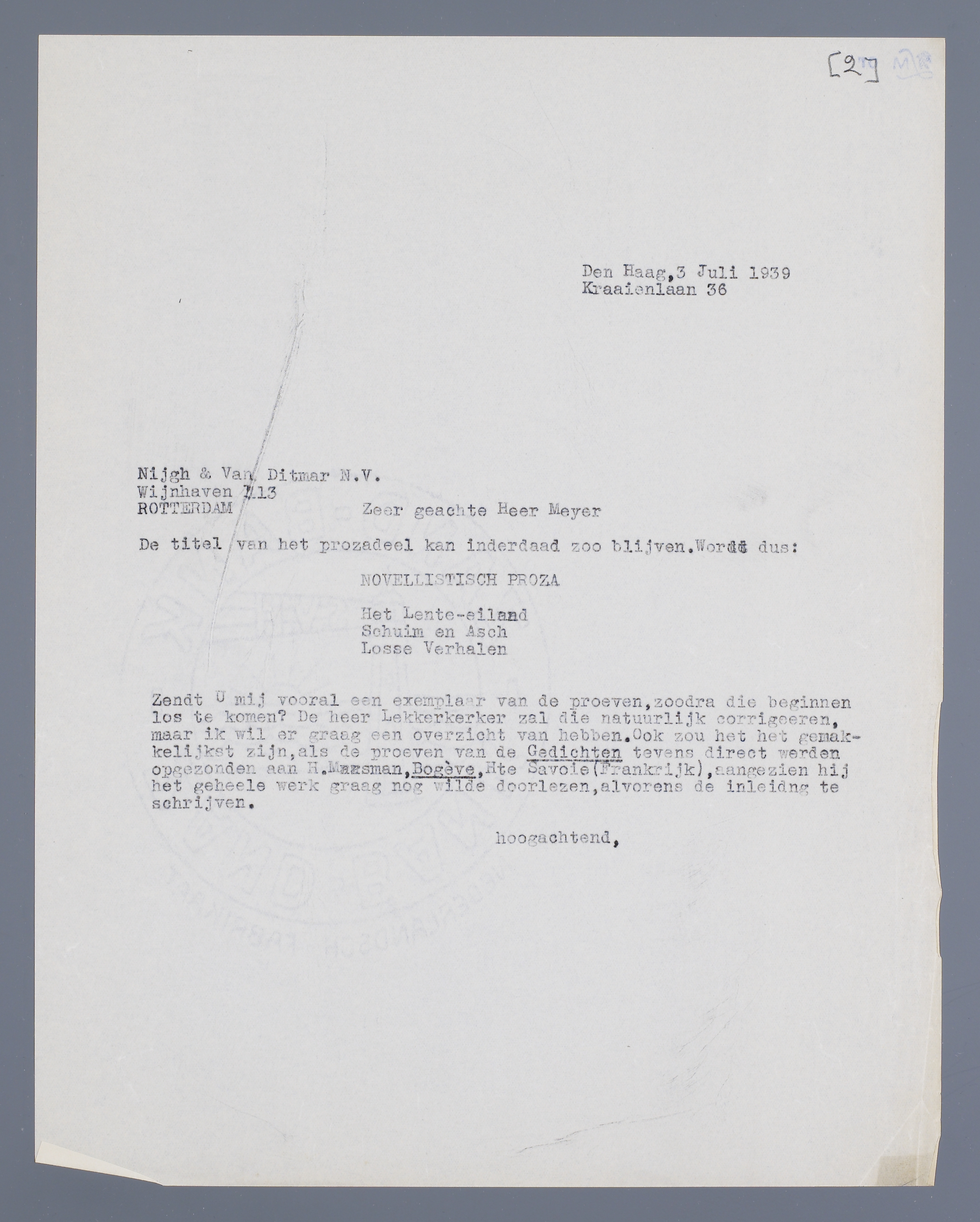 Zendt U mij vooral een exemplaar van de proeven, zoodra die beginnen los te komen? De heer Lekkerkerker zal die natuurlijk corrigeren, maar ik wil er graag een overzicht van hebben. Ook zou het het gemakkelijkst zijn, als de proeven van de gedichten tevens direct werden opgezonden aan de heer H. Marsman, Bogève, Hte Savoie (Frankrijk), aangezien hij het geheele werk graag nog wilde doorlezen, alvorens de inleiding te schrijven.