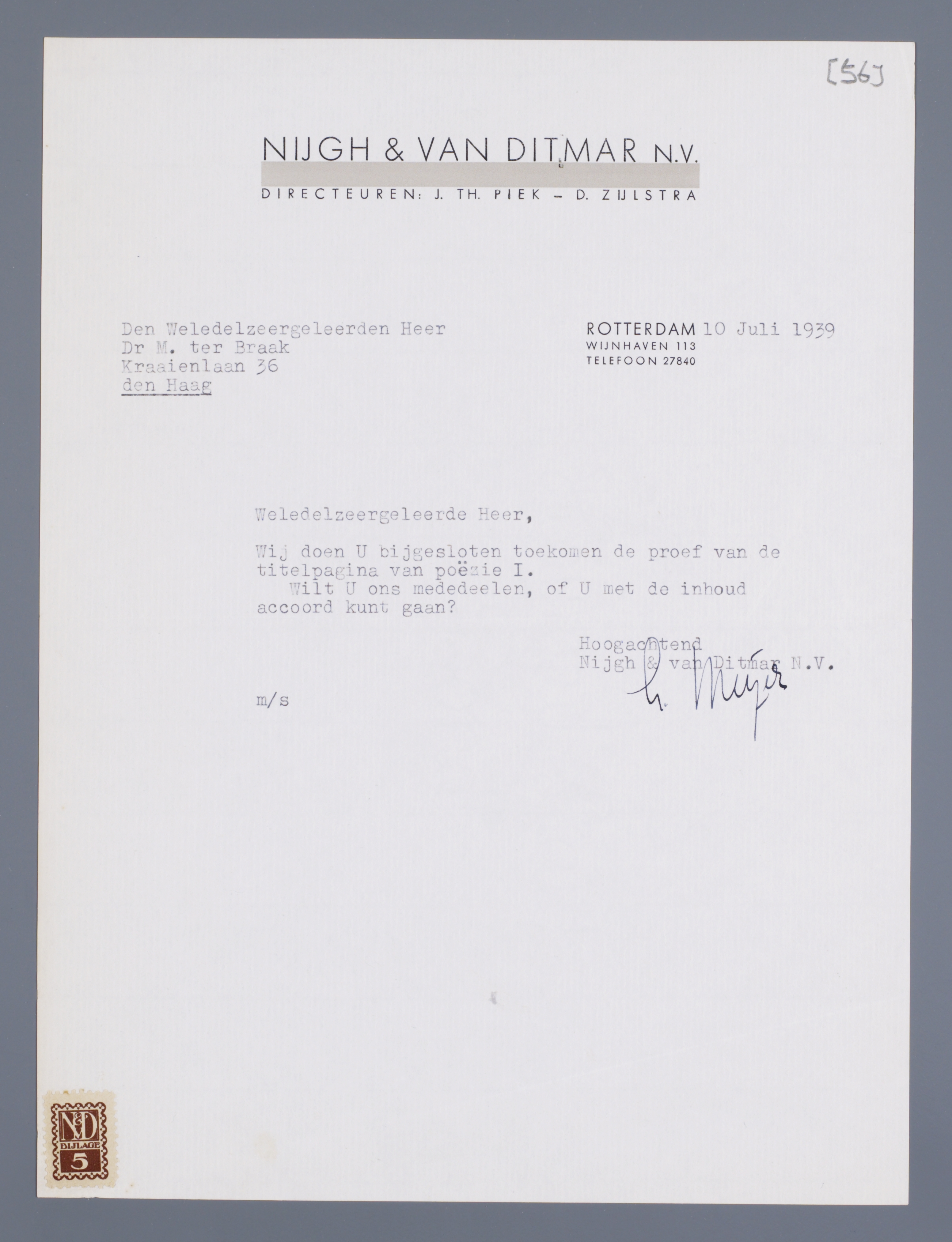 Wij doen u bijgesloten toekomen de proef van de titelpagina van poëzie I.