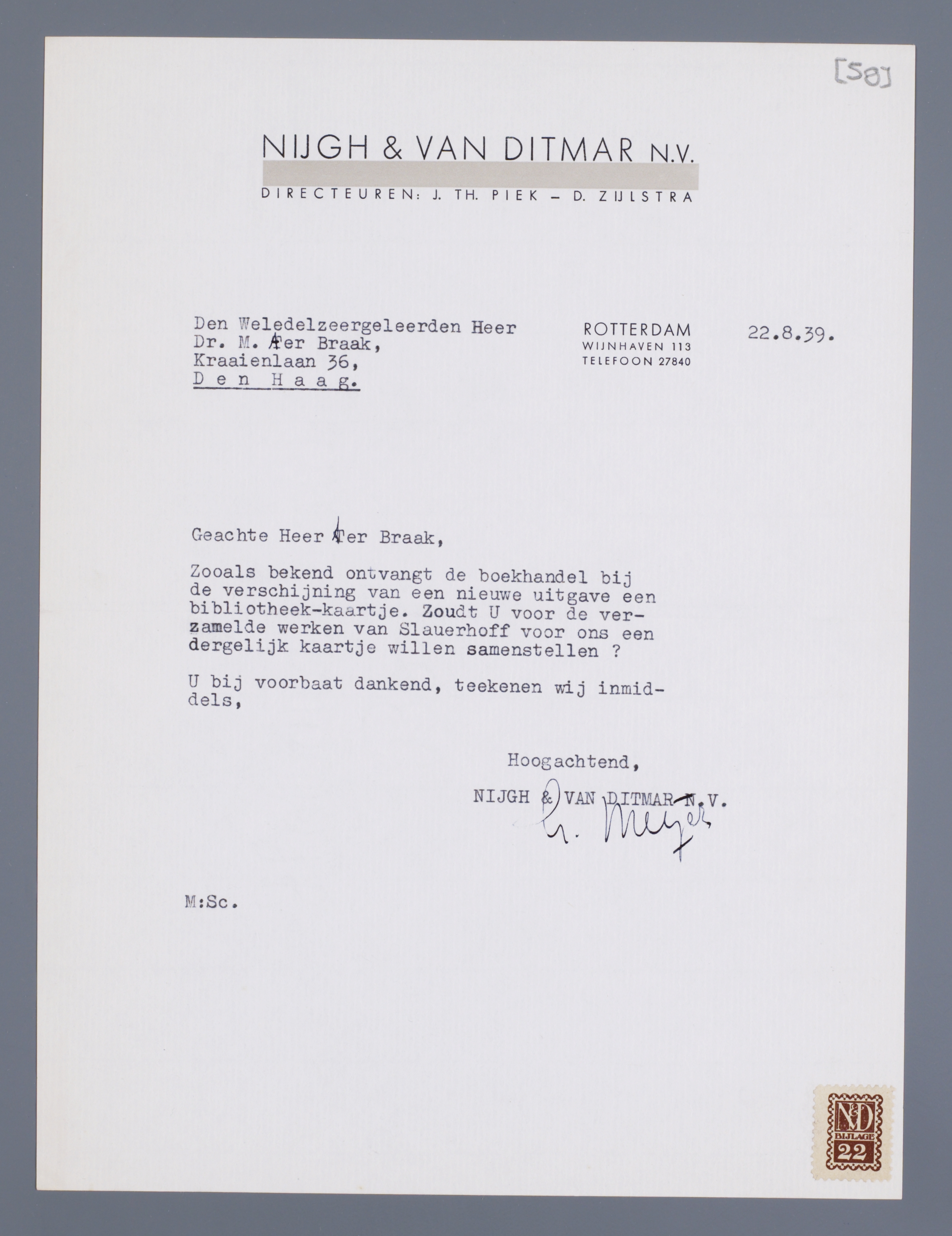 Zooals bekend ontvangt de boekhandel bij de verschijning van een nieuwe uitgave een bibliotheek-kaartje. Zoudt U voor de verzamelde werken van Slauerhoff voor ons een dergelijk kaartje willen samenstellen?
