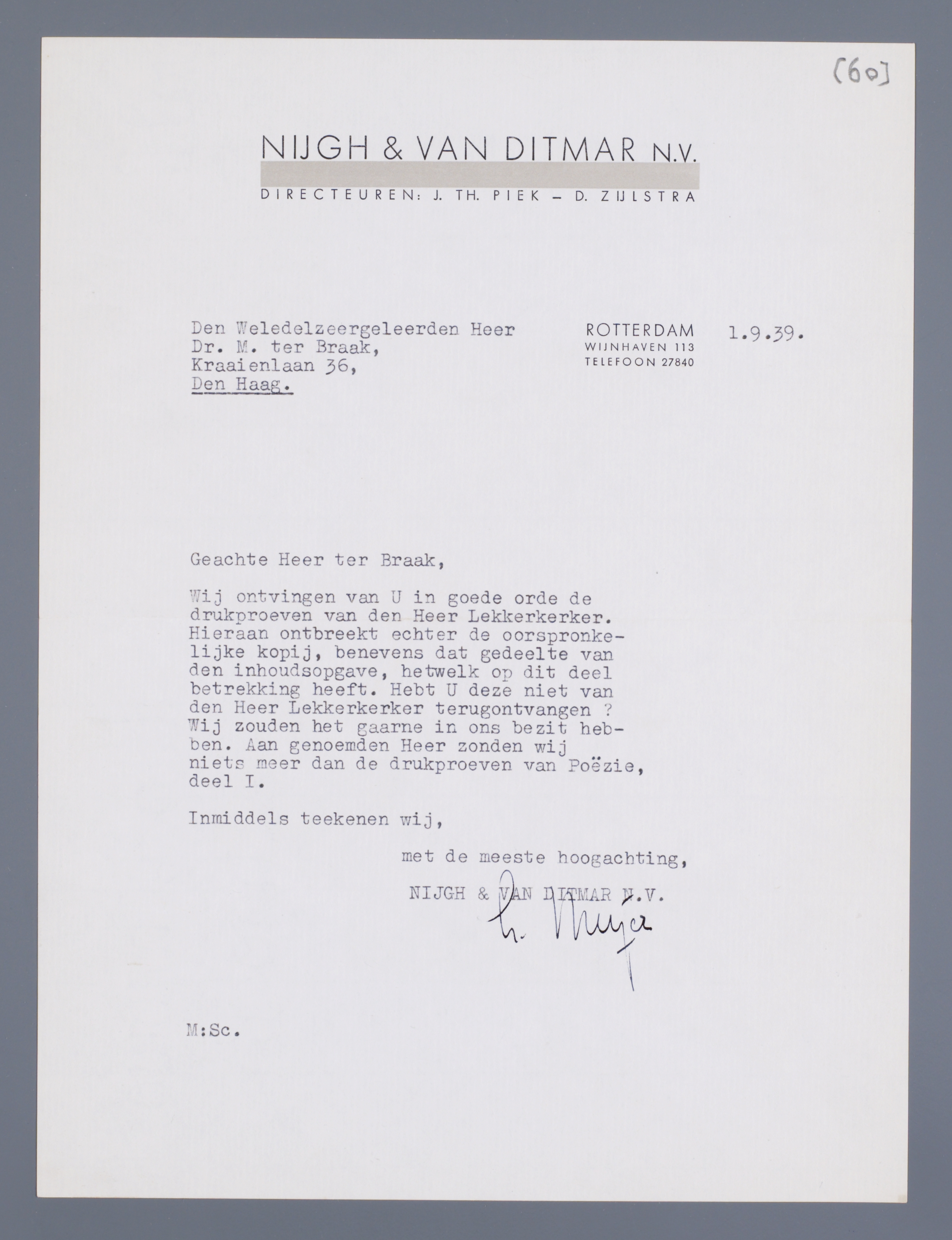 Wij ontvingen van U in goede orde de drukproeven van den Heer Lekkerkerker. Hieraan ontbreekt echter de oorspronkelijke kopij, benevens dat gedeelte van den inhoudsopgave, hetwelk op dit deel betrekking heeft. Hebt U deze niet van den Heer Lekkerkerker terugontvangen? Wij zouden het gaarne in ons bezit hebben. Aan genoemden Heer zonden wij niets meer dan de drukproeven van Poëzie, deel I.